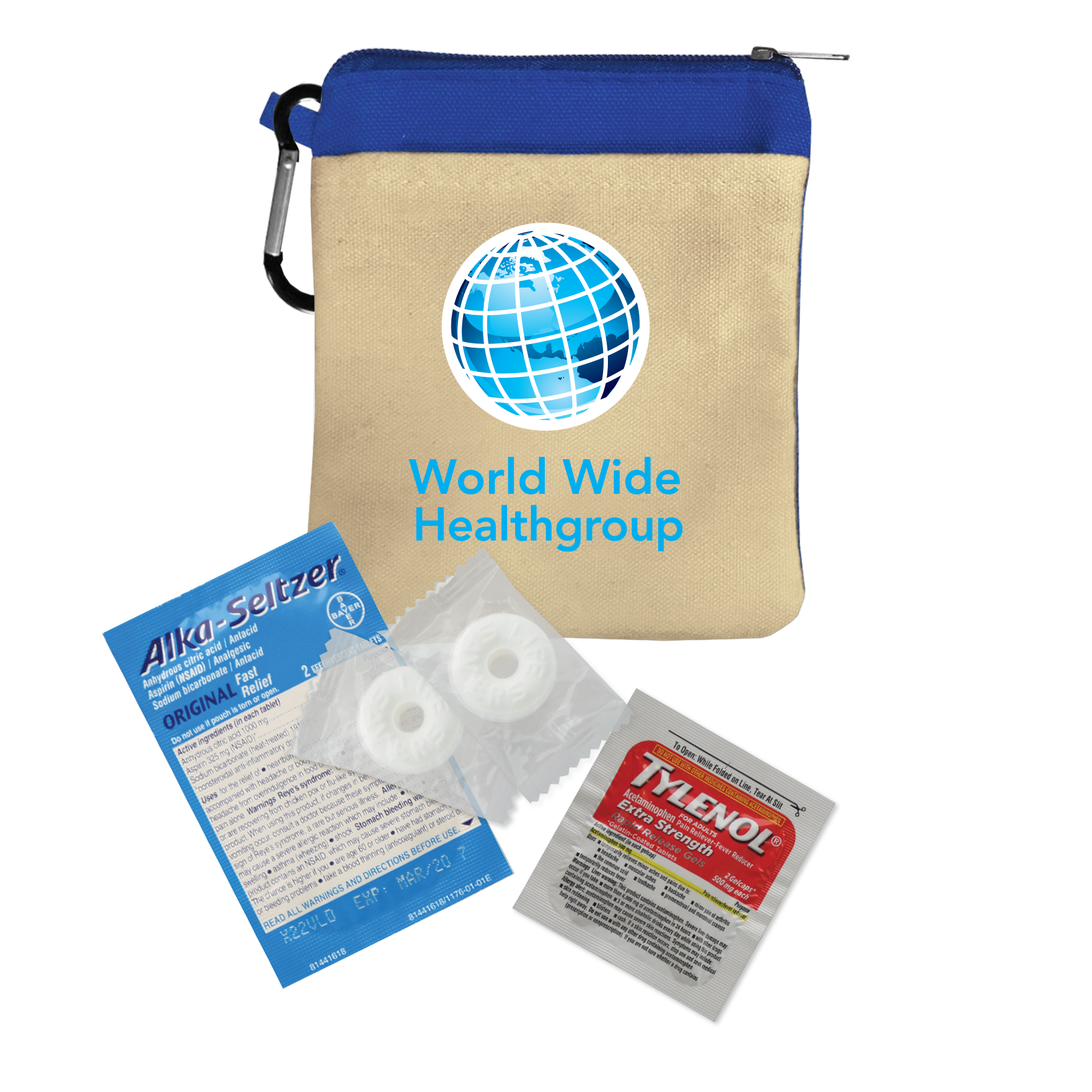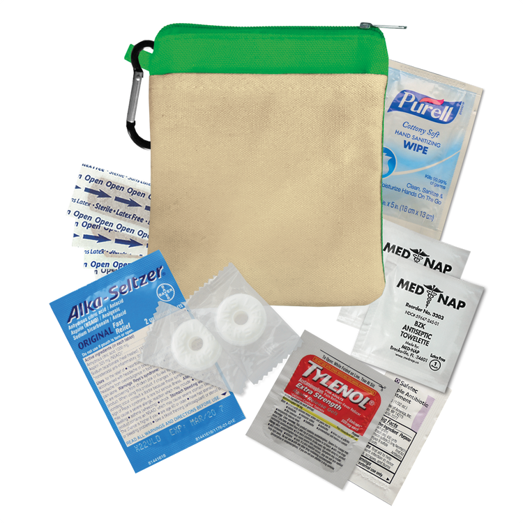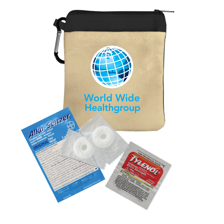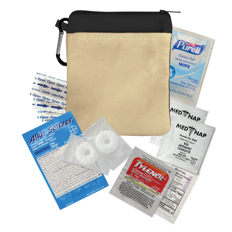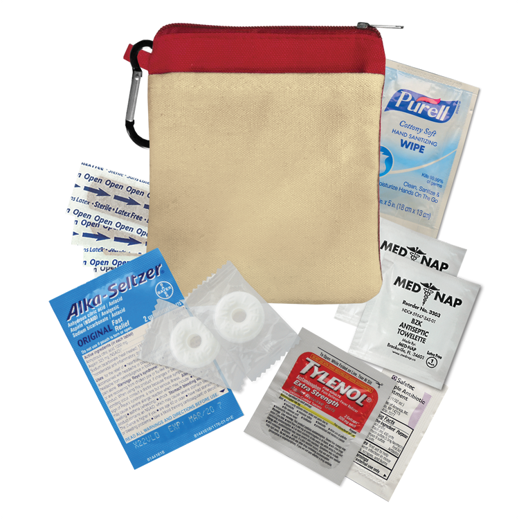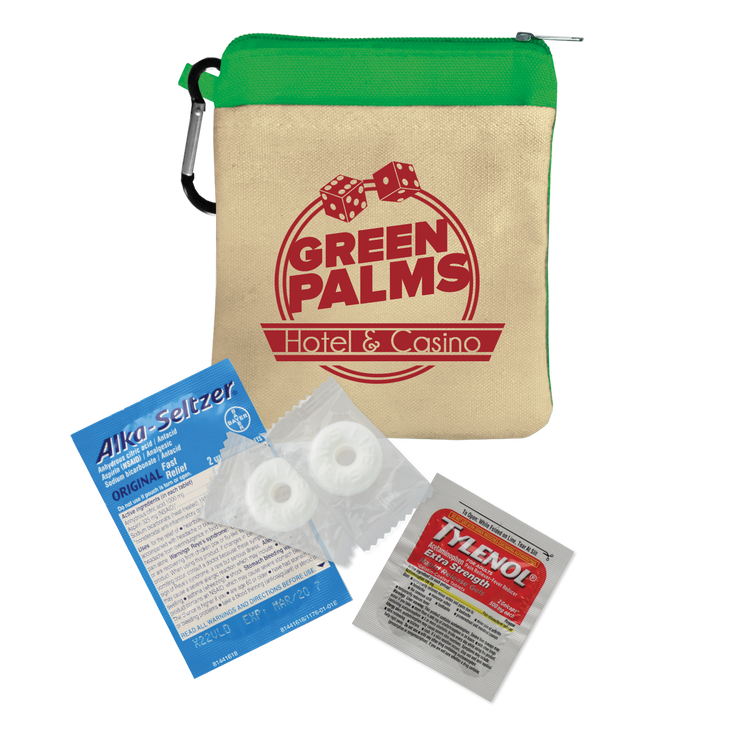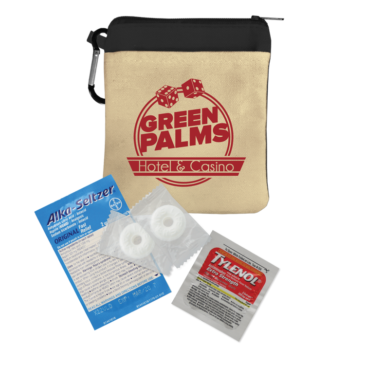 Keep essentials close at hand with this compact 100% cotton canvas pouch designed as a handy recovery kit for late nights. Featuring a colorful accent band, secure zippered closure, and an attached carabiner, it’s perfect for clipping to bags or backpacks. Inside, you’ll find must-have items like Tylenol® pain reliever, Alka-Seltzer® antacid, Purell® hand sanitizer, breath mints, antiseptic towelettes, and more for quick relief and care. Additional decoration charges may apply.