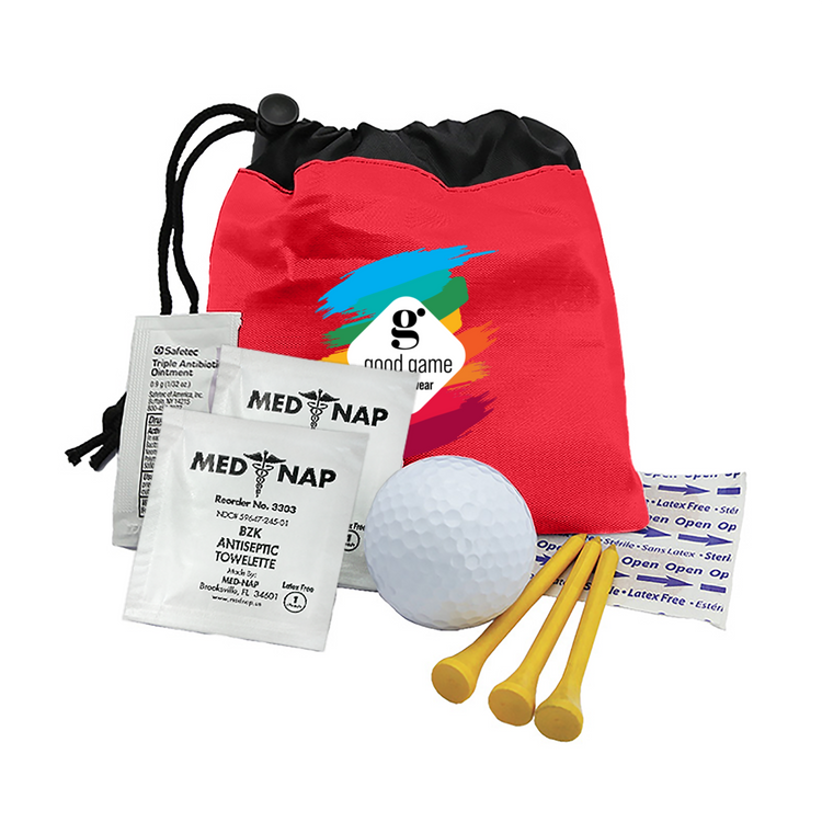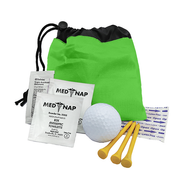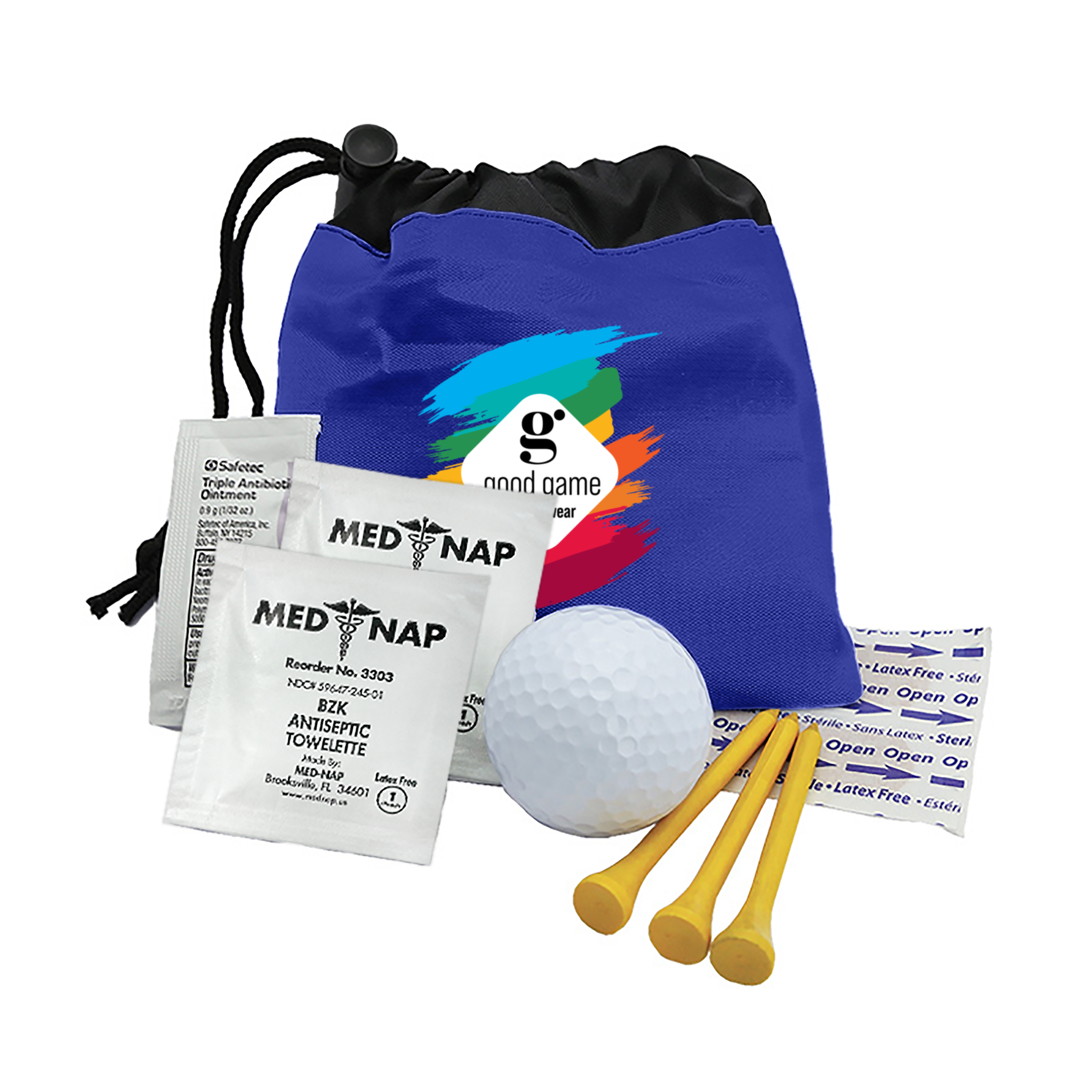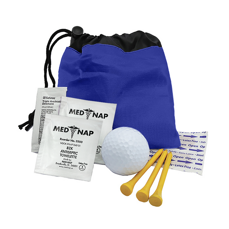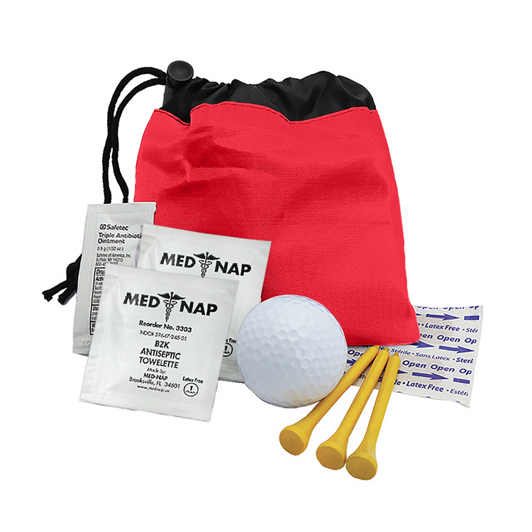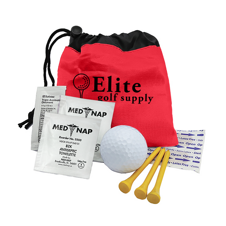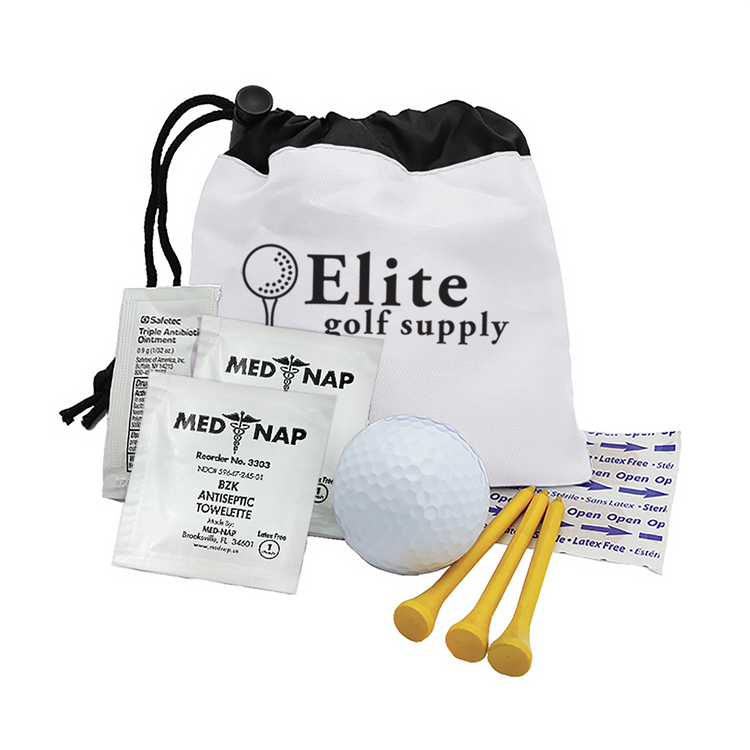 Includes: 2 adhesive bandages, 2 antiseptic towelettes, 1 triple-antibiotic ointment packet, 1 non-imprinted golf ball, 3 non-imprinted golf tees