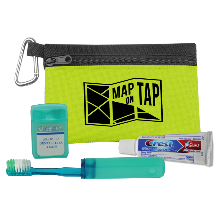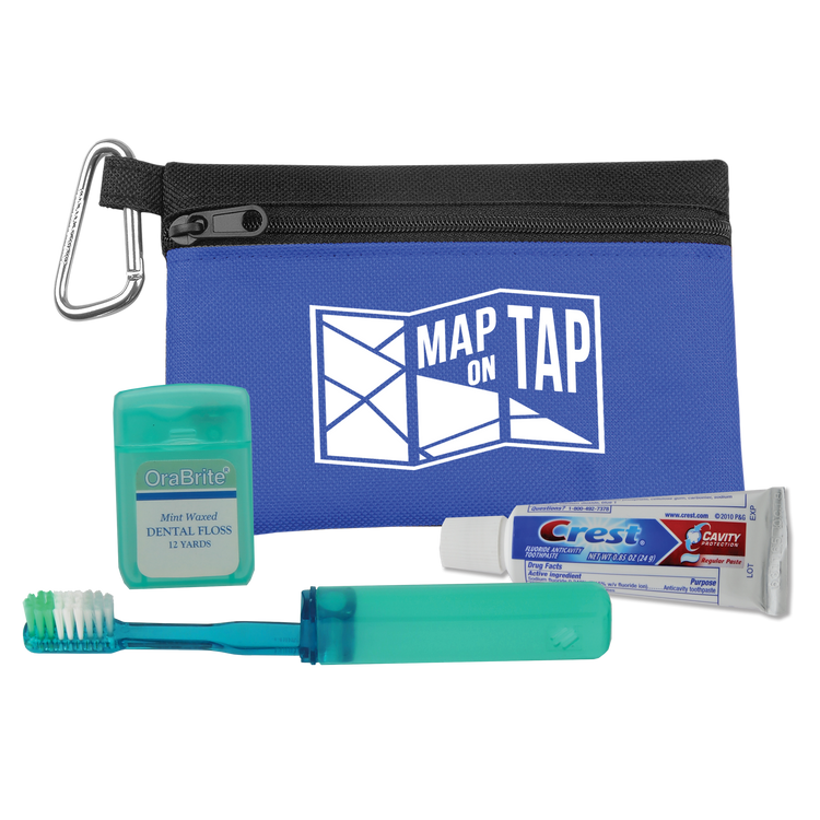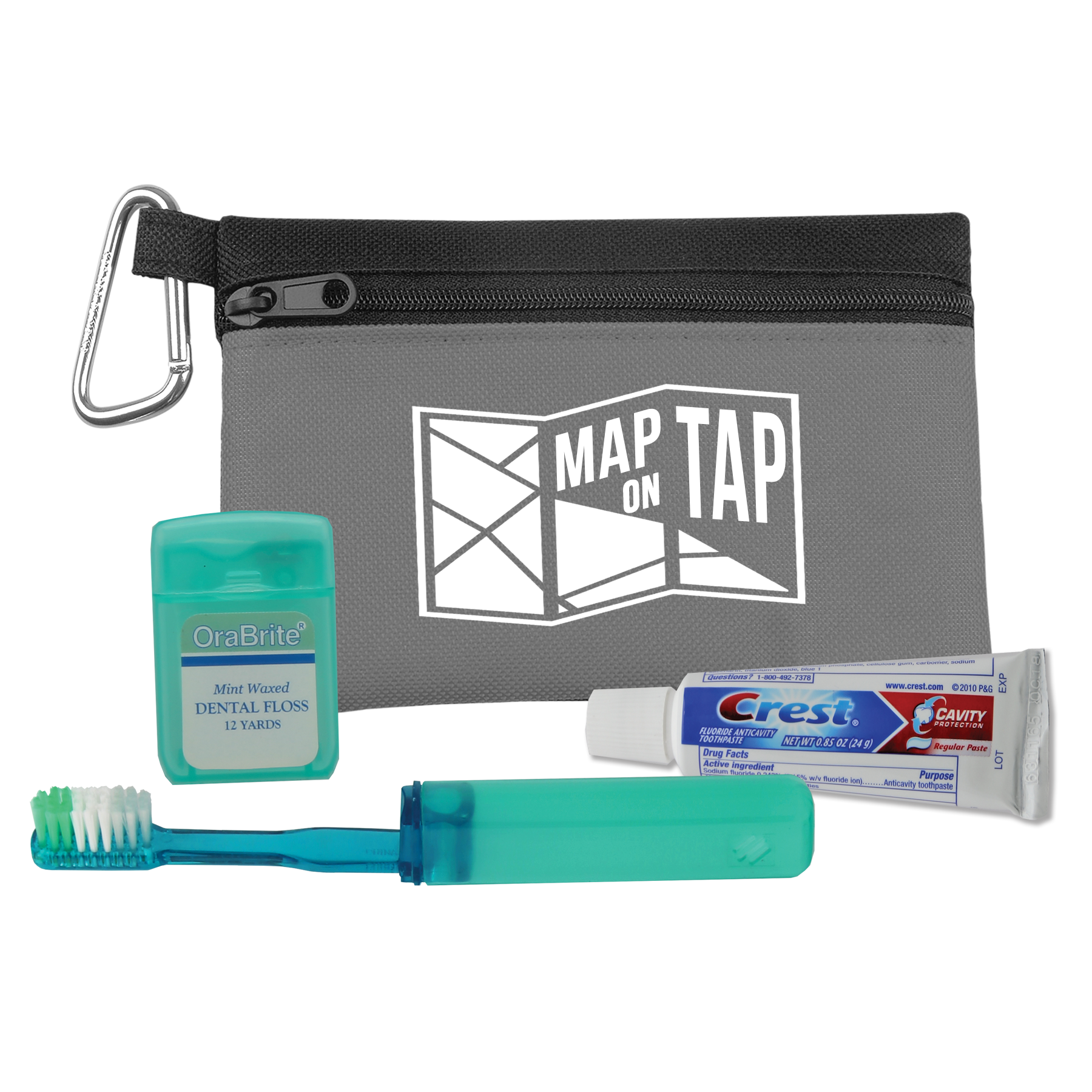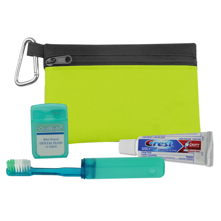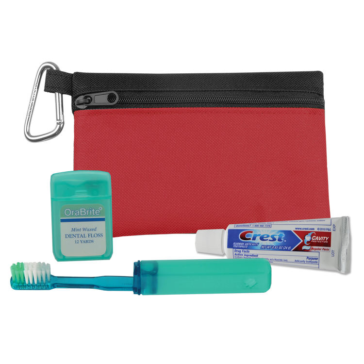 Freshen up on the go with this travel kit packed with everyday dental essentials. The zippered pouch with attached clip makes it easy to carry, while the included travel toothbrush, toothpaste, and waxed dental floss keep your smile looking its best. Additional decoration charges may apply.