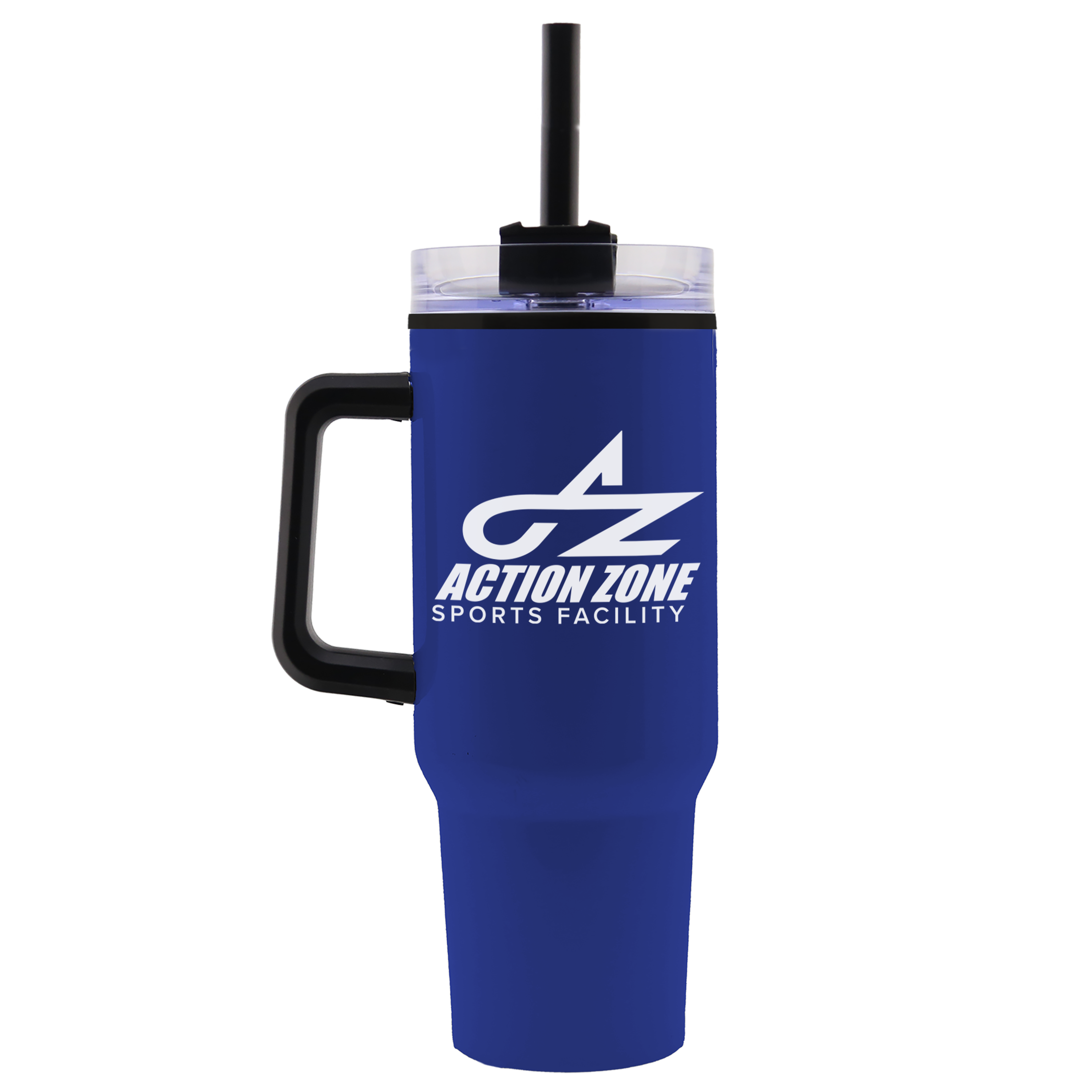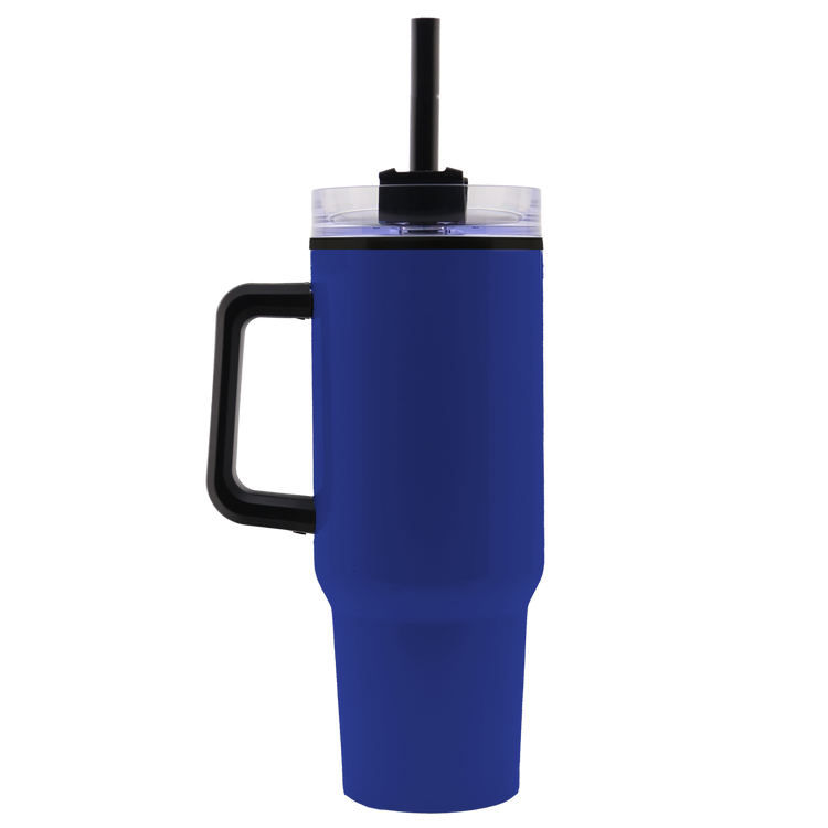 Enjoy all-day refreshment with this 40 oz. handled stainless steel tumbler. Designed with double-wall insulation, it keeps beverages hot or cold for hours, and the clear, screw-on lid features a spill-resistant design with a straw for versatile sipping. This travel mug is an exceptional choice for companies, universities, and nonprofits ready to take their brand wherever it roams. Additional decoration charges may apply.