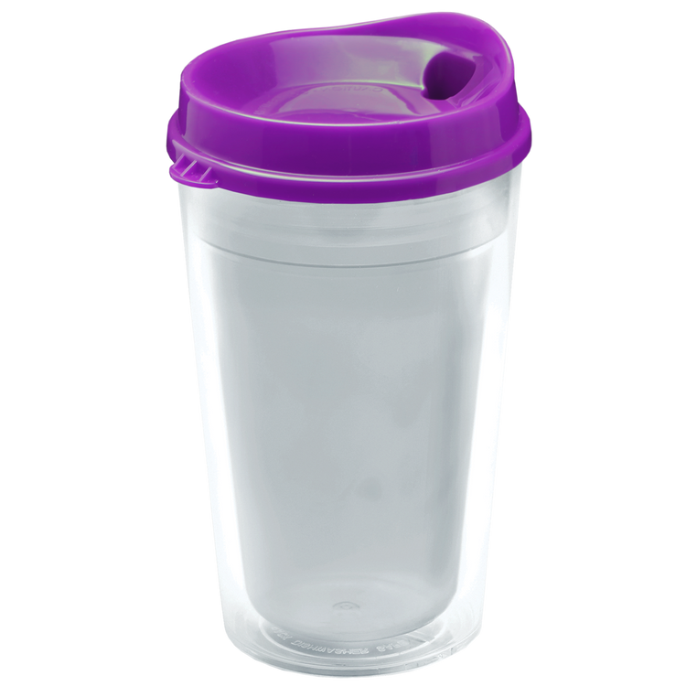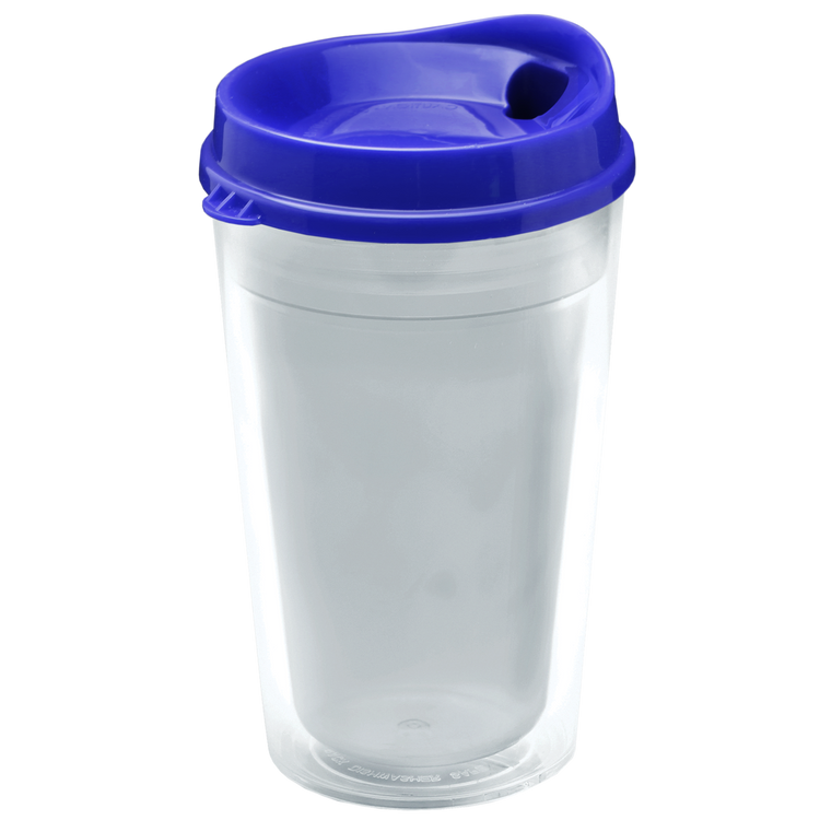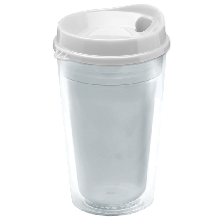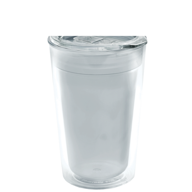 This sleek double-wall insulated 16 oz. tumbler keeps beverages chilled longer while its clear outer wall adds a modern look. The design also helps reduce condensation, so your hands stay dry and comfortable. It features a full-color wraparound insert printed on a clear material, offering unlimited customization options. With a sip-through lid and a size that fits most cup holders, it’s the perfect companion for on-the-move hydration. Additional decoration charges may apply.