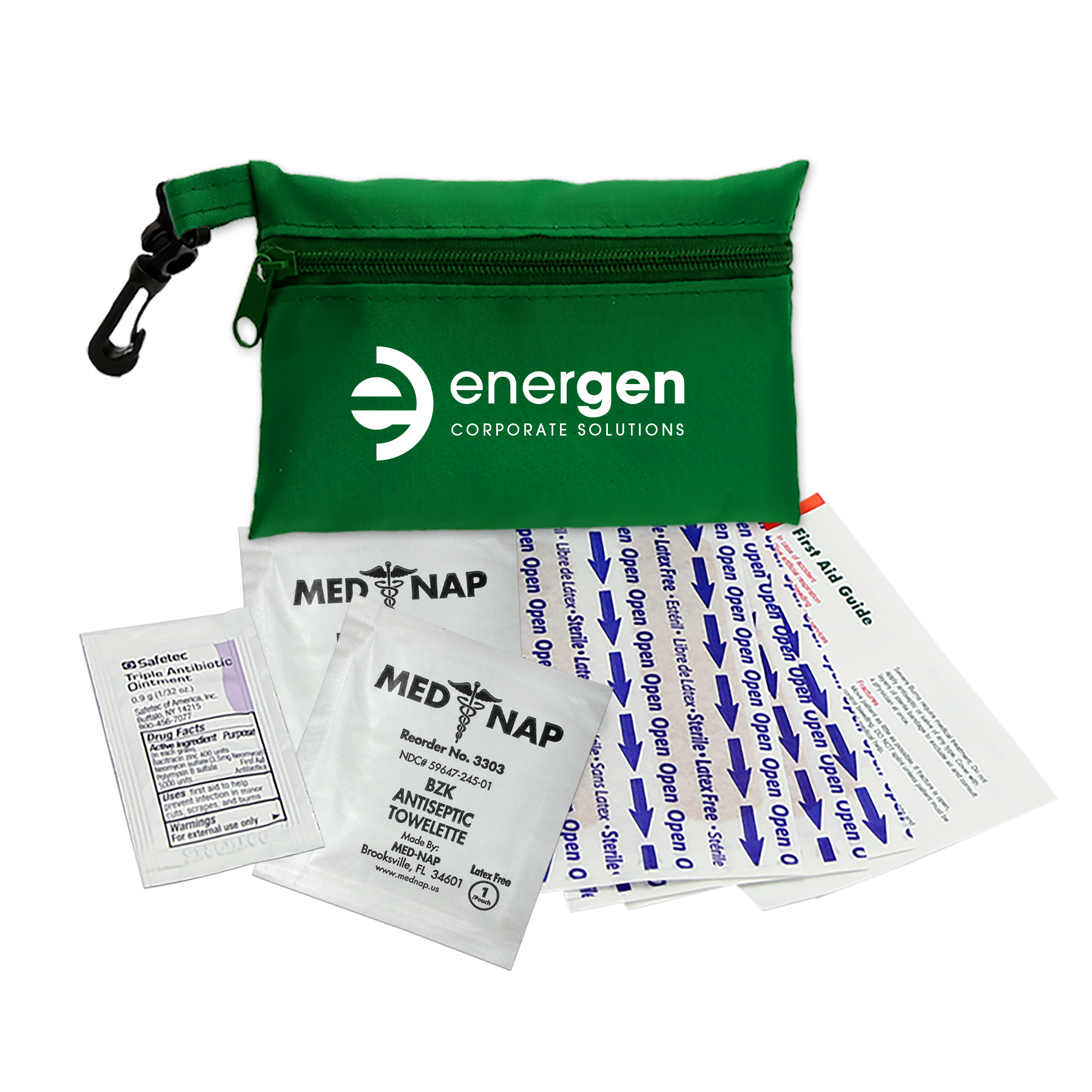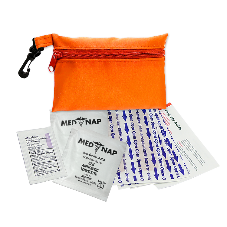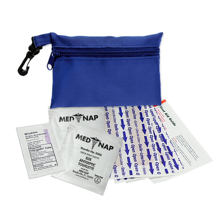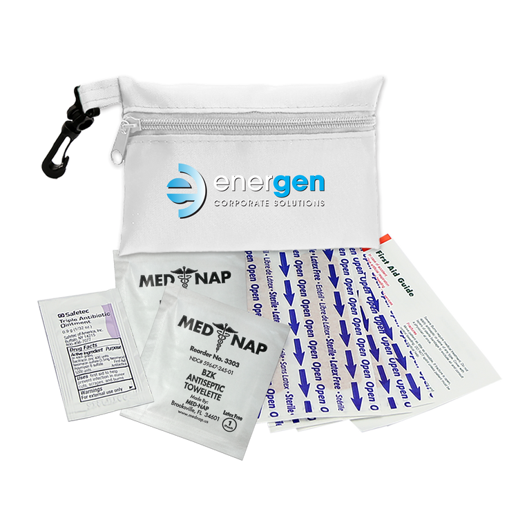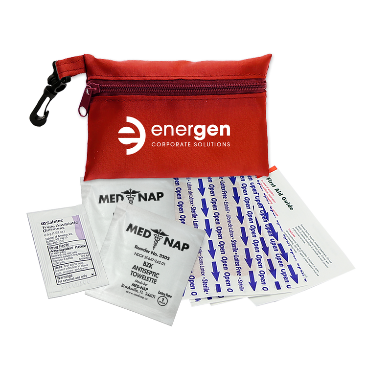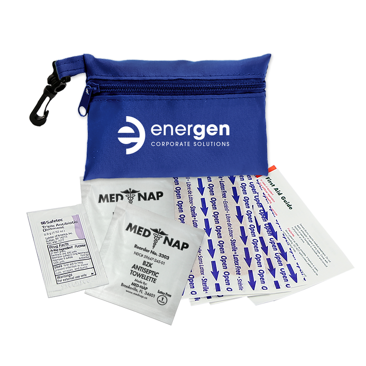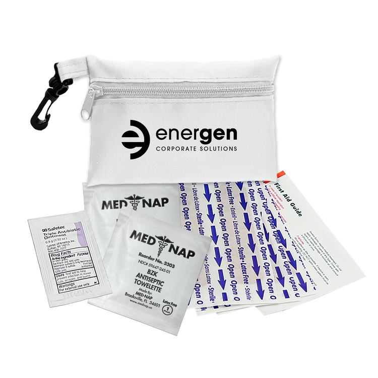 This compact first aid kit is designed to keep you prepared for life’s little emergencies. The durable 100% RPET bag holds essential supplies in an organized way, making it quick and convenient to treat minor cuts and scrapes. Perfect for storing in a purse, backpack, desk, or car, it ensures peace of mind whether you’re at home, at work, or on the move. The kit includes six adhesive bandages, two antiseptic towelettes, one triple-antibiotic ointment packet, and a first aid guide. Additional decoration charges may apply.