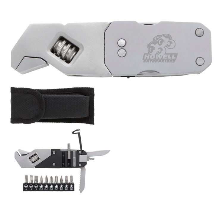 Handle adjustments and repairs with ease using this compact, all-in-one pocket tool. Designed for versatility, it features an adjustable wrench and 13 interchangeable bits, including bicycle spoke tools and flat and Phillips screwdrivers. Additional functionalities include a straight knife and a saw knife, making this tool perfect for a wide range of tasks. Packaged in a sleek carrying case with a convenient belt loop, it’s always within reach for quick fixes and on-the-go needs. The ultimate blend of practicality and portability, this tool ensures you’re prepared for any situation. Additional decoration charges may apply.