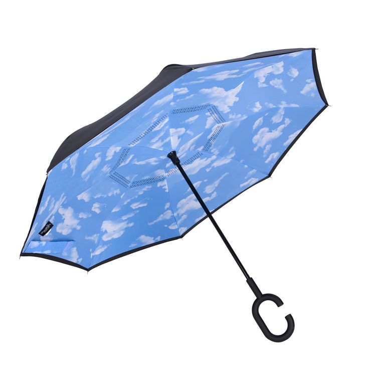Manual open and close inverted umbrella with a reverse-closing design creates a cone when closed, keeping water contained