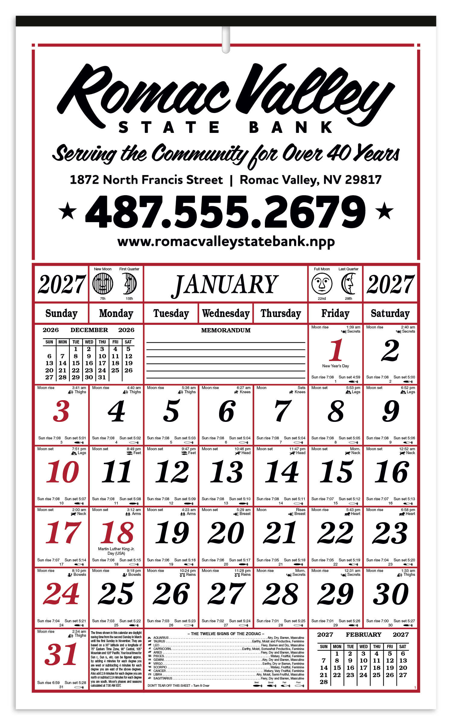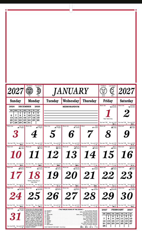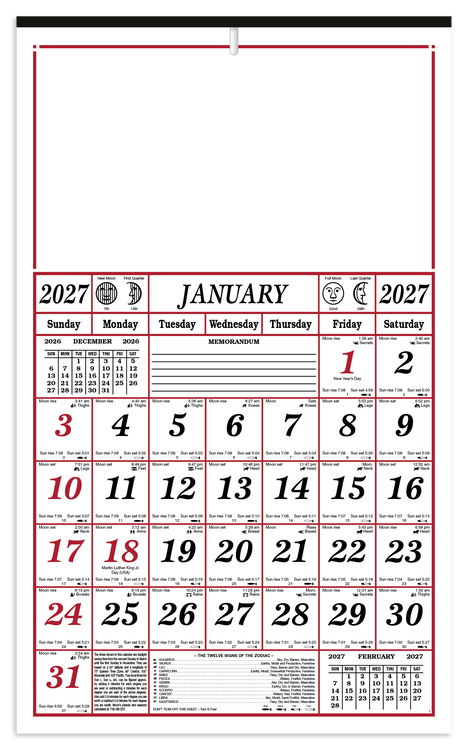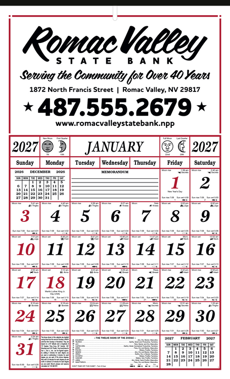 This 7-sheet almanac calendar is printed on both sides and is packed with helpful information. It tracks daily sunrise and sunset times, moon phases, weather information, and more at a glance. The SFI® label means that materials used for this product have been responsibly sourced. Additional decoration charges may apply.