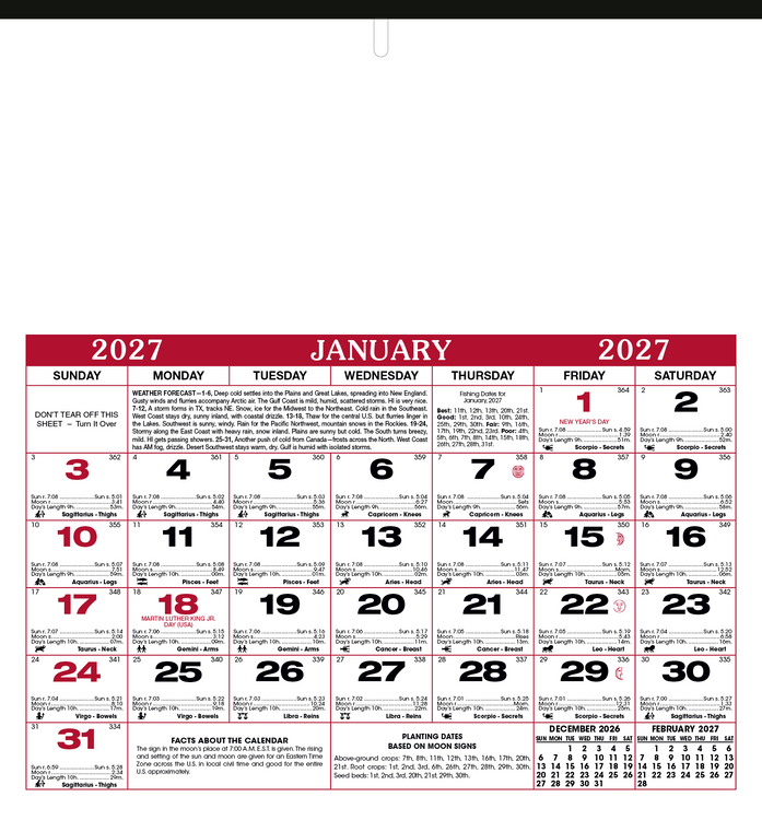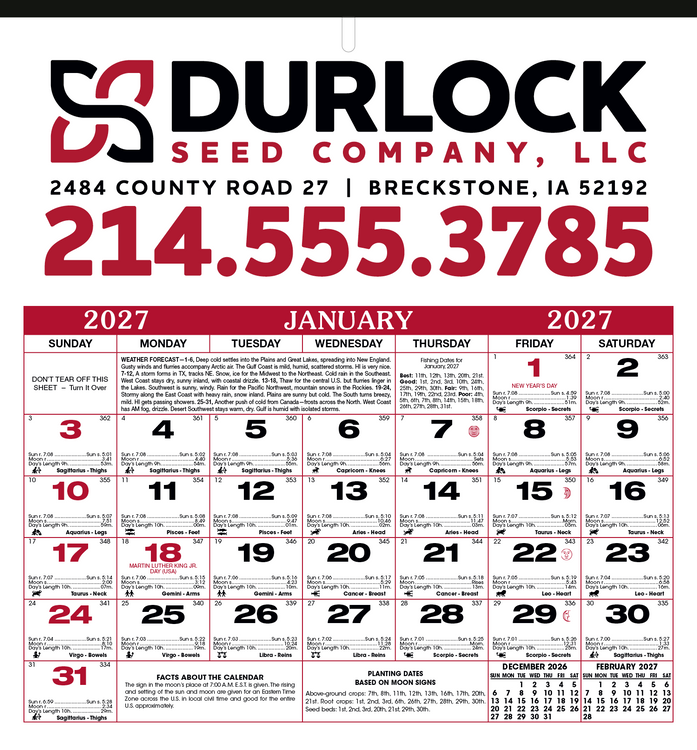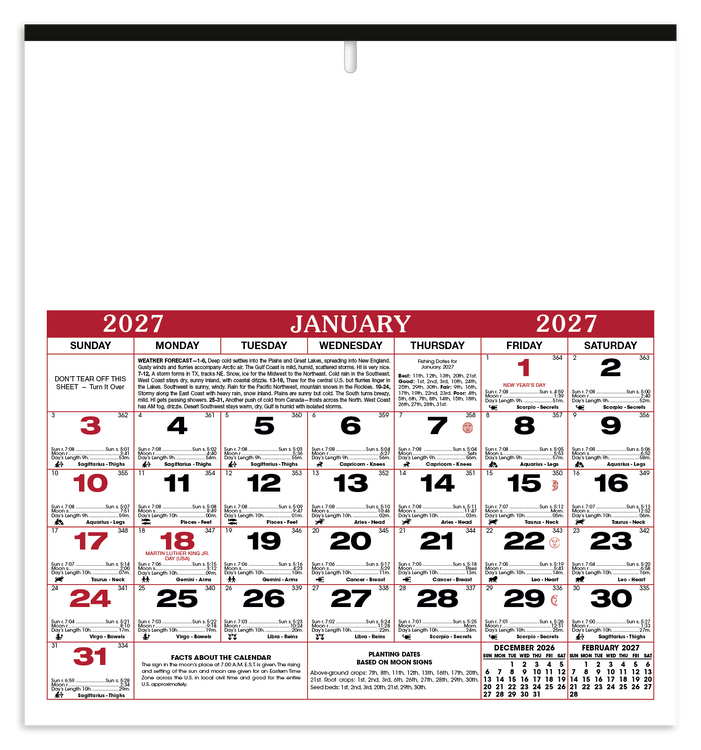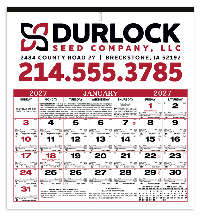 This 6-sheet almanac calendar is printed on both sides and tinned at the top. It tracks daily sunrise and sunset times, moon phases, and weather information at a glance. The SFI® label means that materials used for this product have been responsibly sourced. Additional decoration charges may apply.