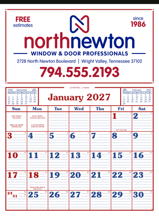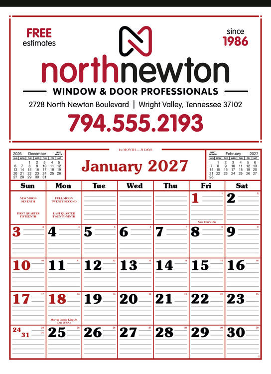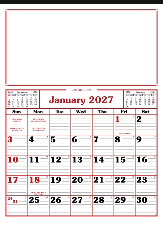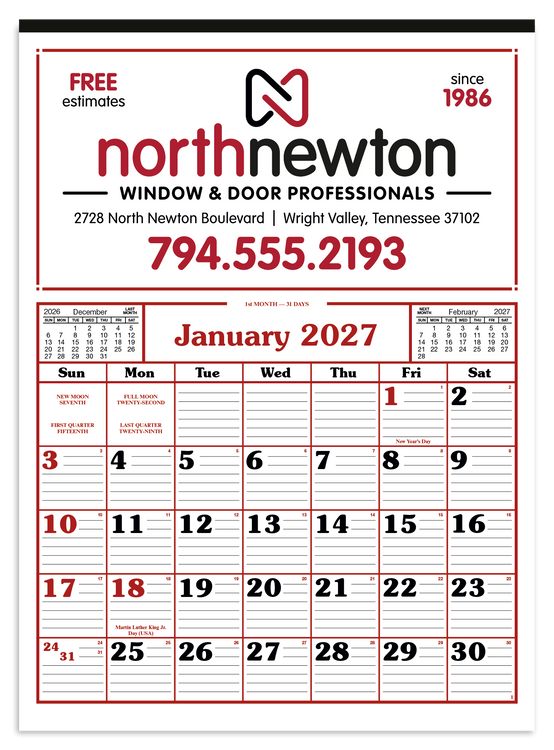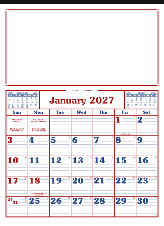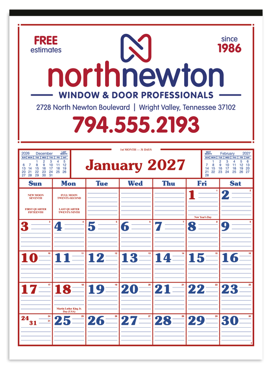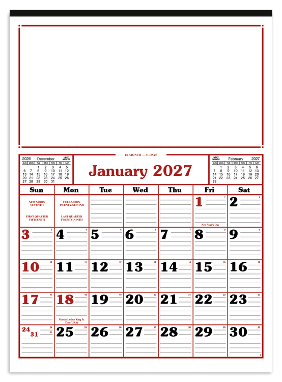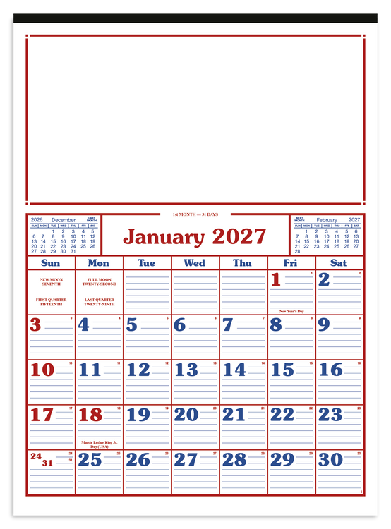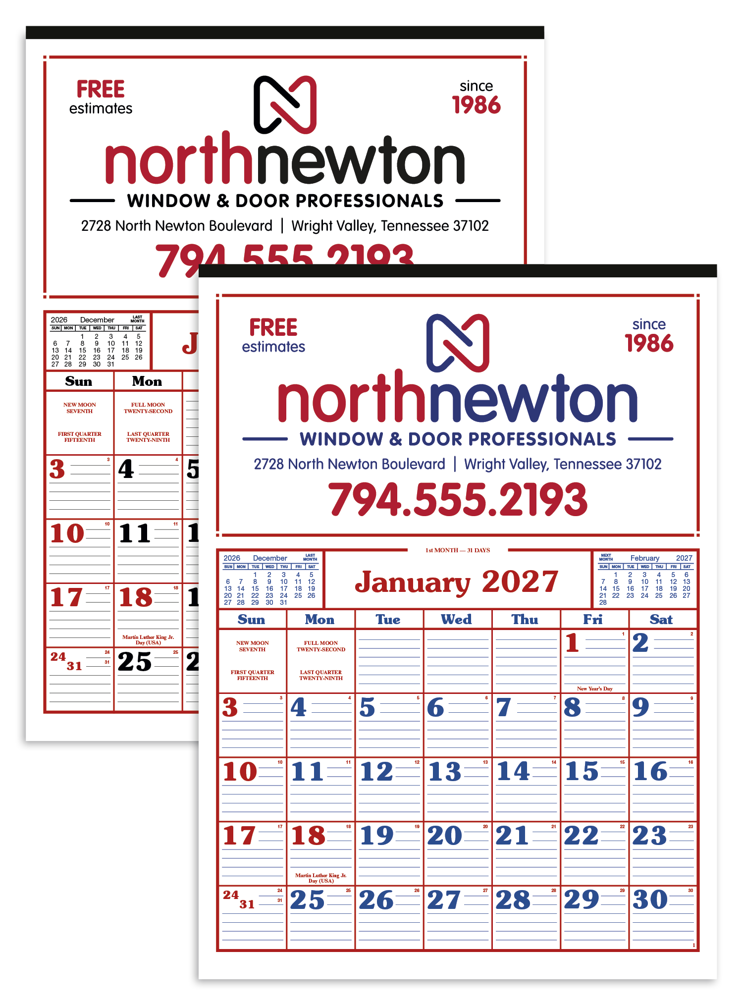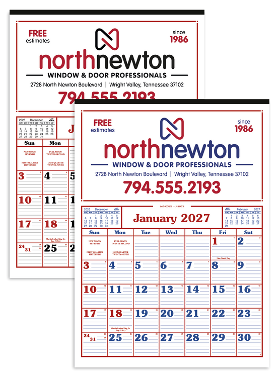 Keep track of the date at a glance with this large-format 12-sheet commercial calendar. Lined date blocks make it easy to keep track of dates and stay on top of your schedule. The SFI® label means that materials used for this product have been responsibly sourced. Additional decoration charges may apply.