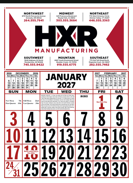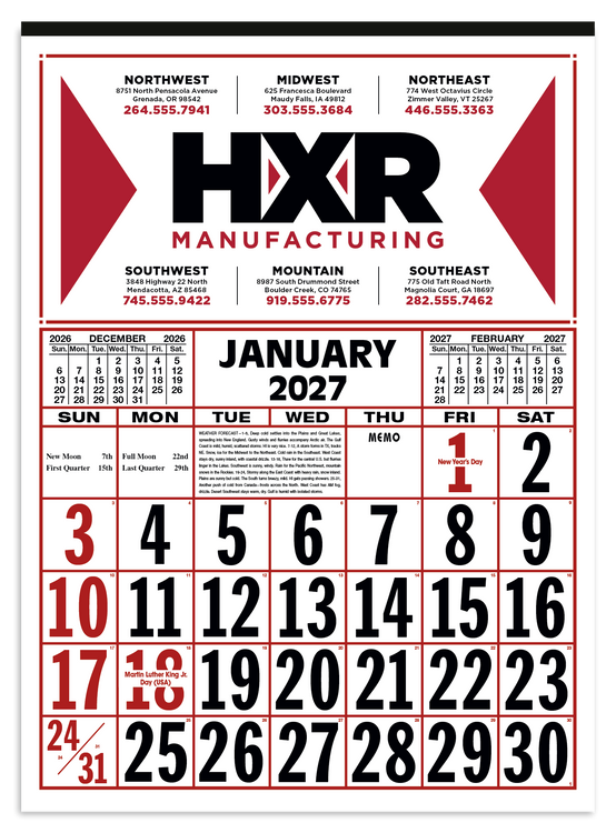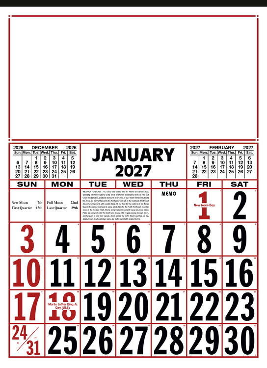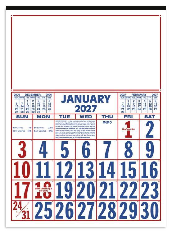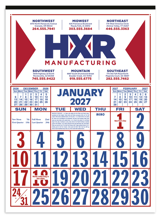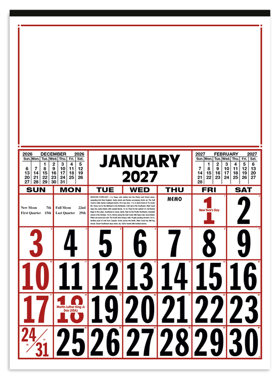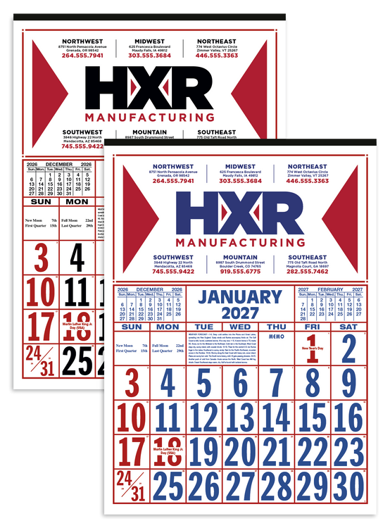 Keep track of the date at a glance with this large-format 12-sheet commercial calendar. The bold numbers and clear layout make it easy to stay organized, while the previous and upcoming months provide convenient reference. The SFI® label means that materials used for this product have been responsibly sourced. Additional decoration charges may apply.