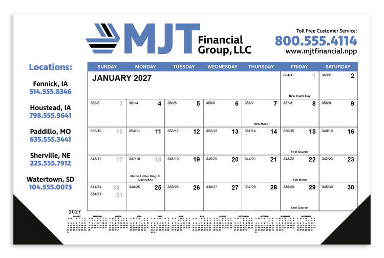 Stay organized with this compact desk pad, perfect for smaller spaces. The larger date blocks provide extra room for appointments, while the side margin area lets you showcase your company services. Vinyl corners keep everything neat and tidy. The SFI® label means that materials used for this product have been responsibly sourced. Additional decoration charges may apply.