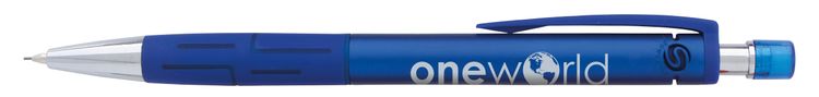 The metallic barrel of this refillable mechanical pencil is perfectly complemented by a tone-on-tone rubberized grip with graphic design and coordinating translucent cap to protect the eraser. Comes with Graphite, 0.5mm #2 lead Additional decoration charges may apply.