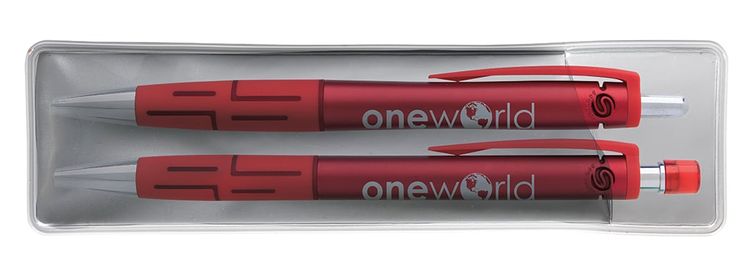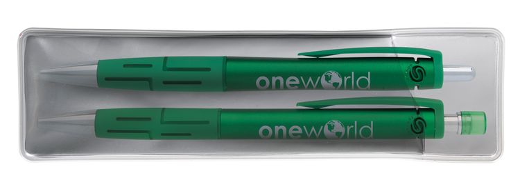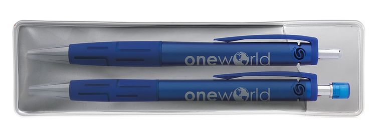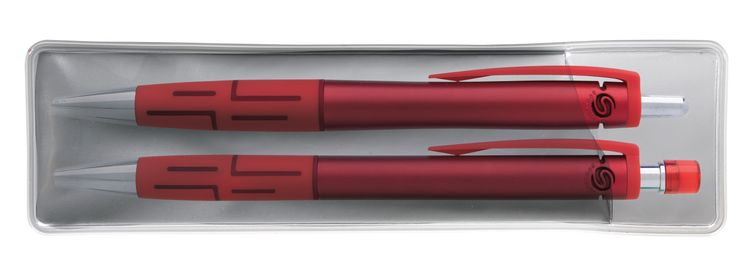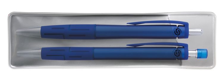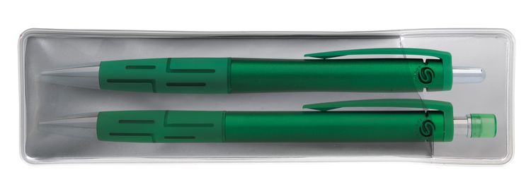 Make your brand truly stand out with these premium, modern-looking writing instruments! This set includes a Souvenir® Daven pen and mechanical pencil that come conveniently stored in an accompanying pouch. The transparent front of the pouch provides great visibility for your logo, which can be imprinted on the barrels of both writing instruments. Additional decoration charges may apply.