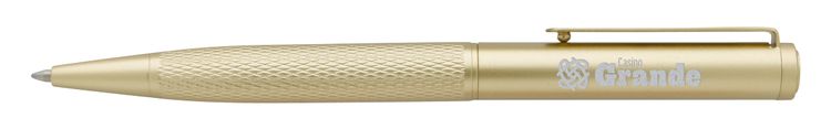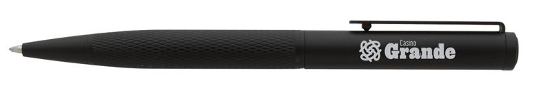 Sleek and sophisticated, this monochromatic twist-action pen combines a matte metal finish with a hatched-pattern grip for ultimate style. Its fine-point, tungsten-carbide ball delivers smooth, fraud-resistant gel ink, making it perfect for signing important documents or crafting flawless notes. With a laser-engraved imprint, this luxury pen is a durable and elegant addition to your writing arsenal. Comes with a velour sleeve. Additional decoration charges may apply.