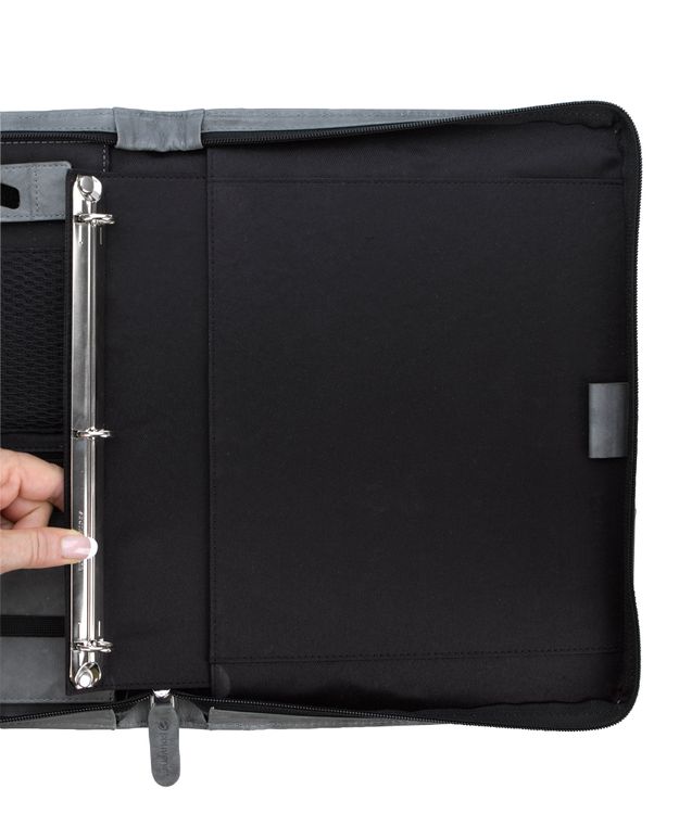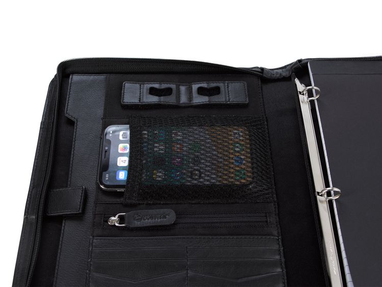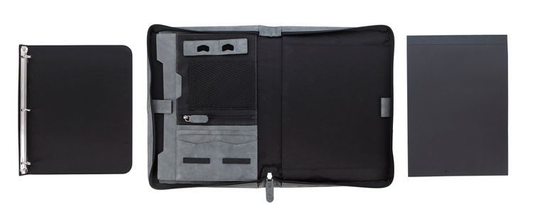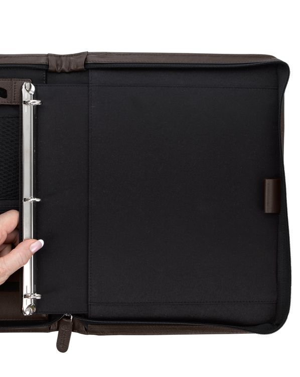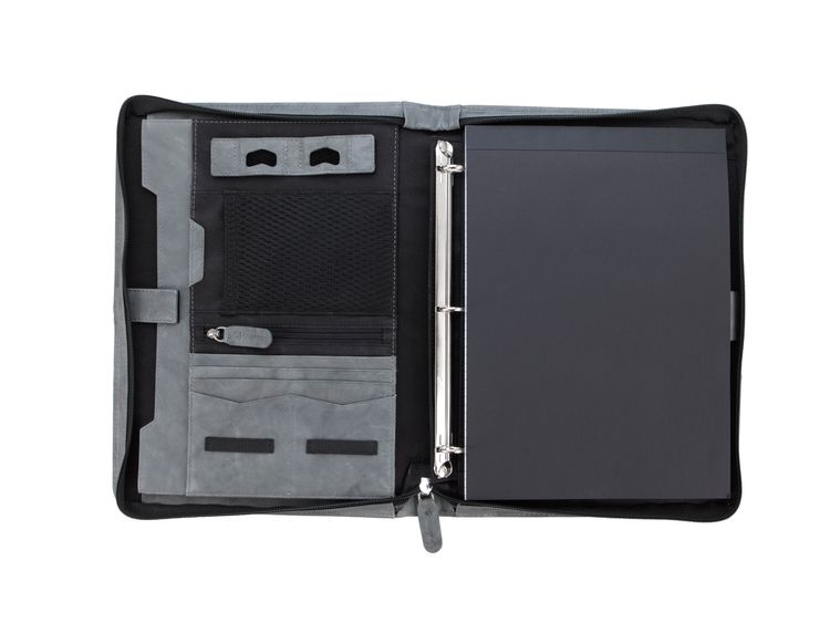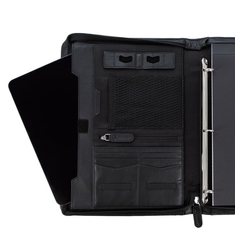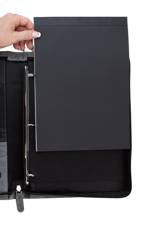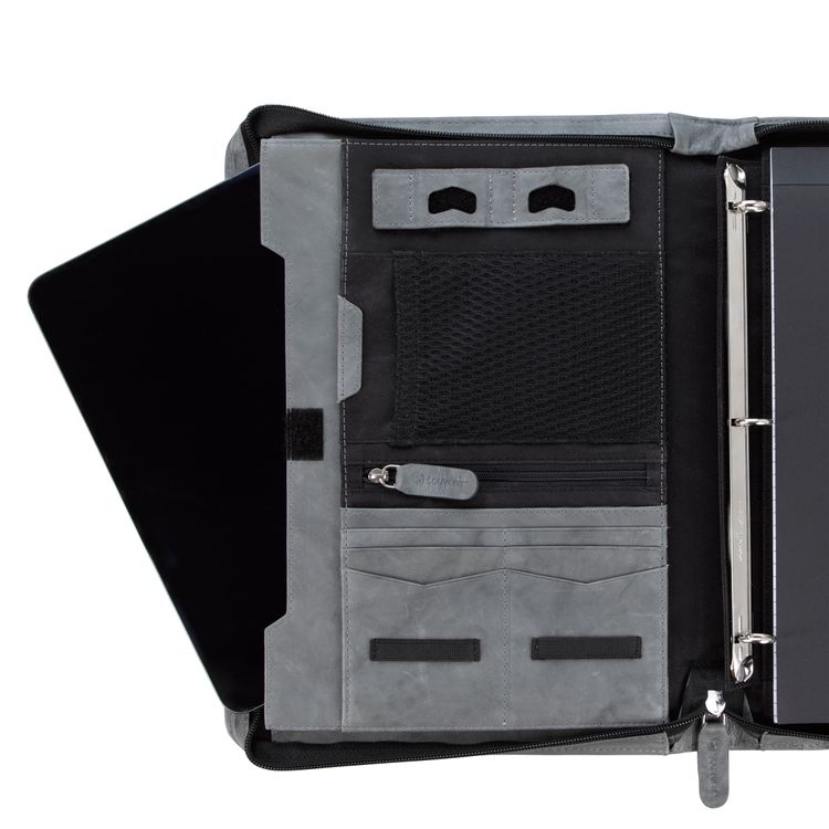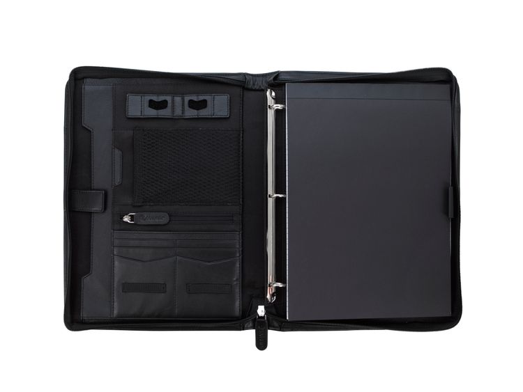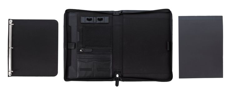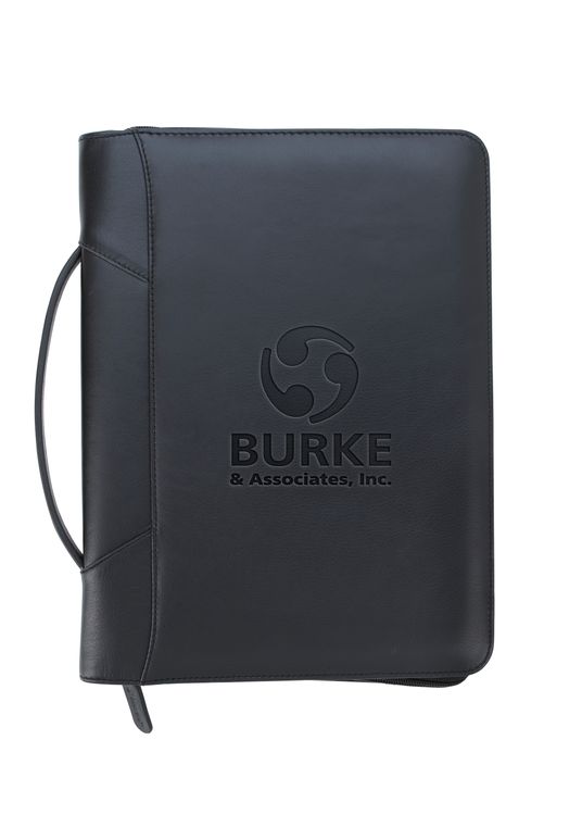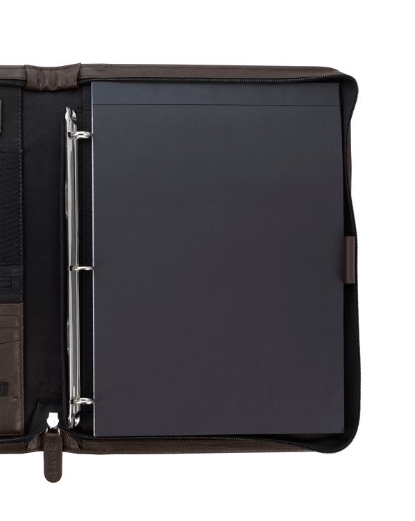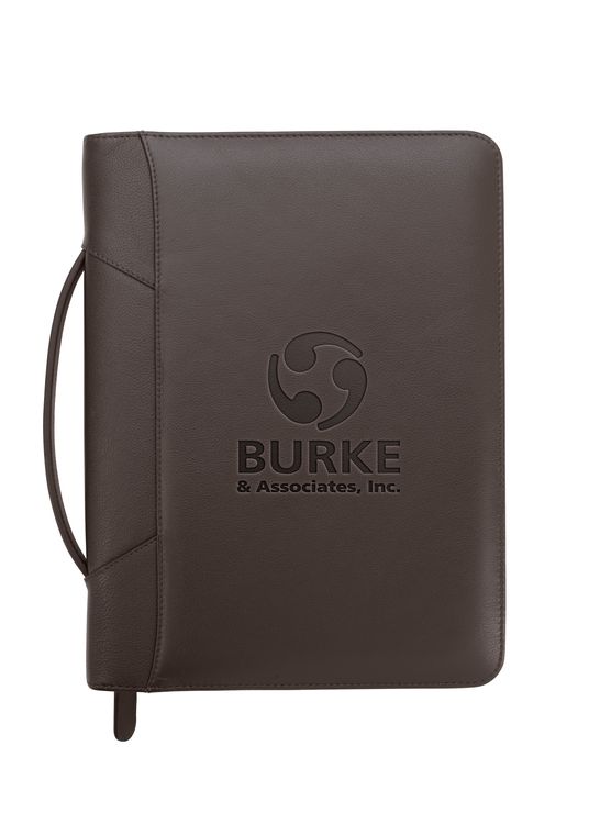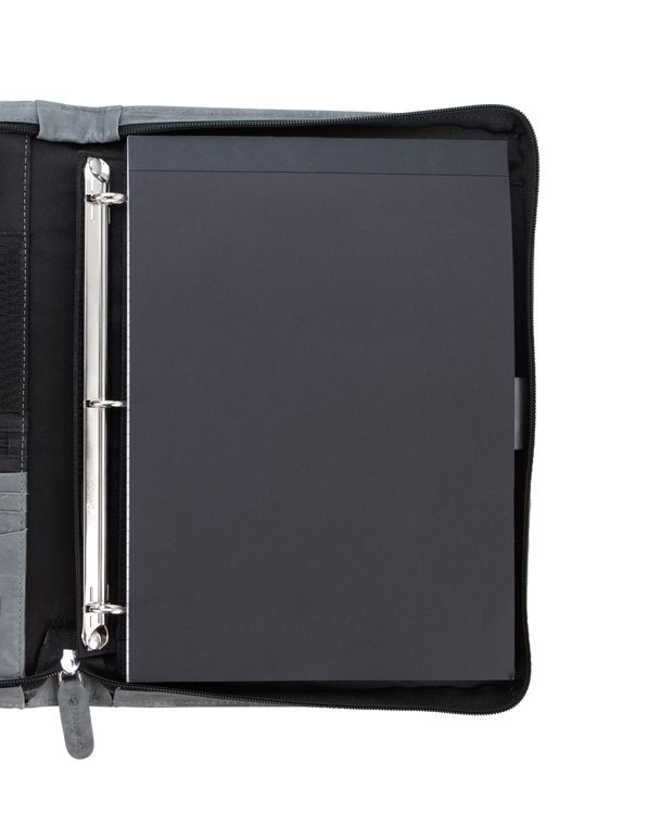 Stay organized and make a lasting impression with this premium leather zippered padfolio. Designed with a built-in handle and sleek leather pulls, it combines professional style with everyday function. The cotton-lined interior features a tablet pocket, phone stand, zip and card storage, elastic bands for cables, and a detachable 3-ring binder with an FSC-certified notepad. From meetings to on-the-go productivity, this padfolio is crafted to perform as beautifully as it looks. Because it is a natural material, irregularities in the consistency of this product’s leather are inherent to its natural beauty and personality. Additional decoration charges may apply.
