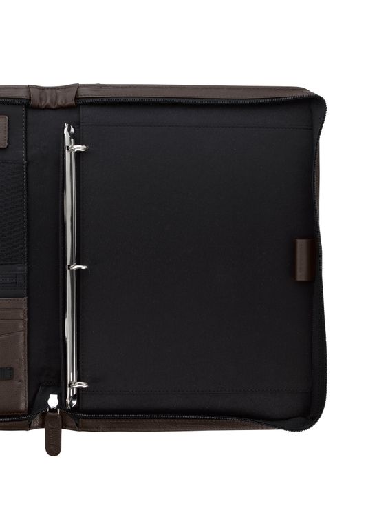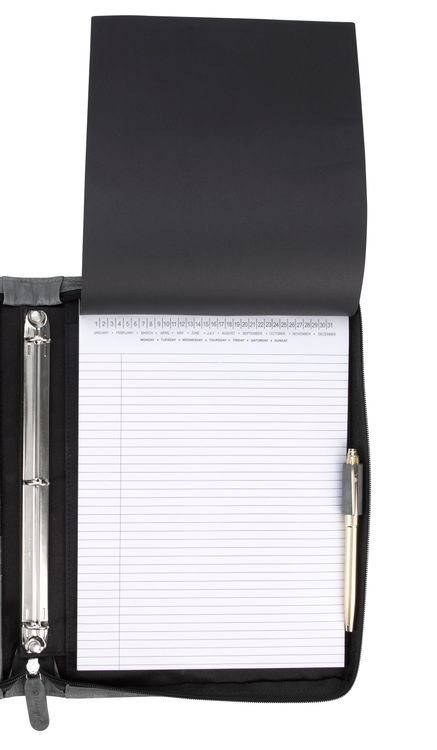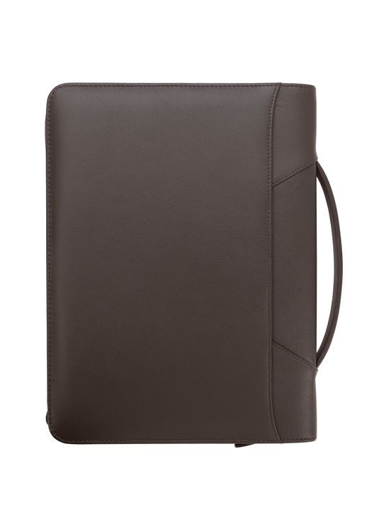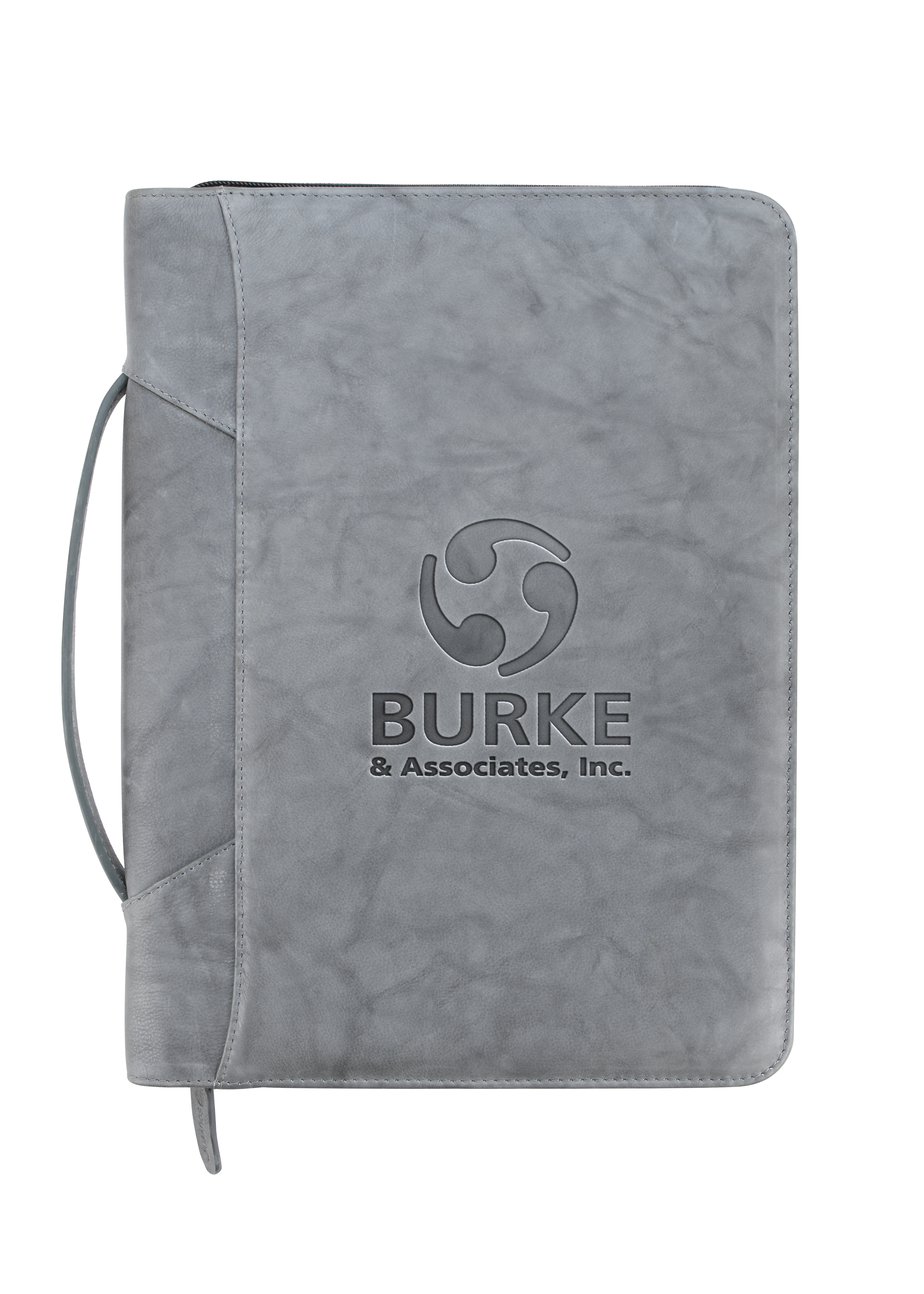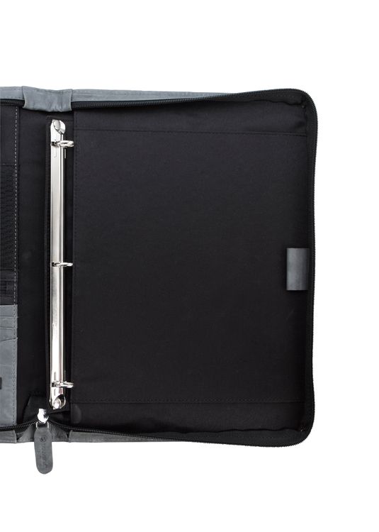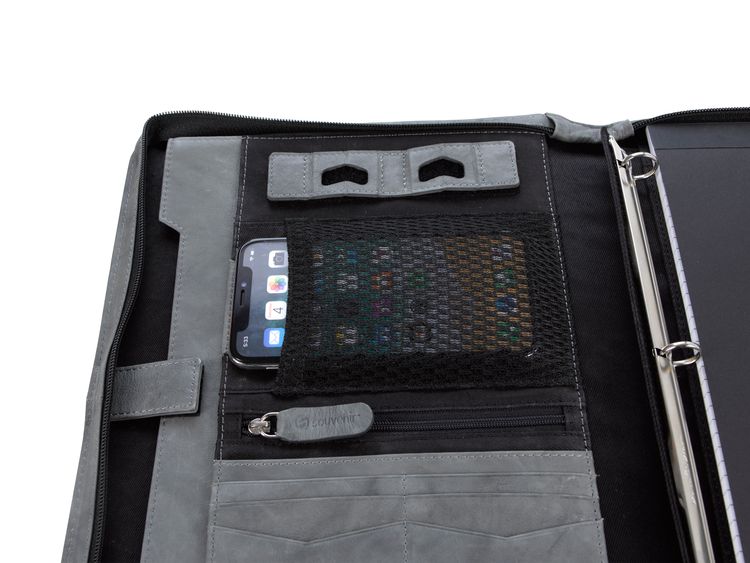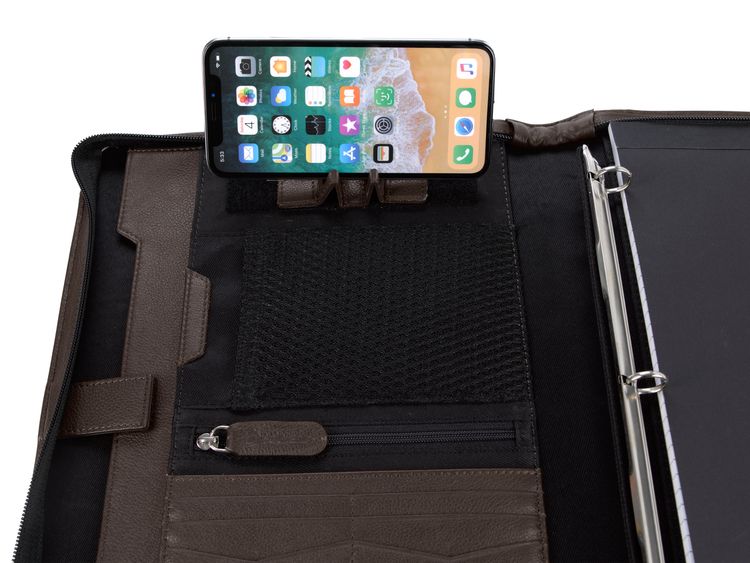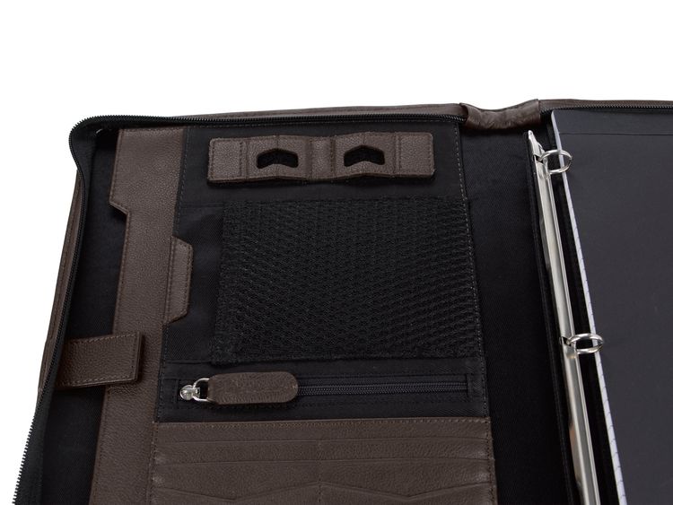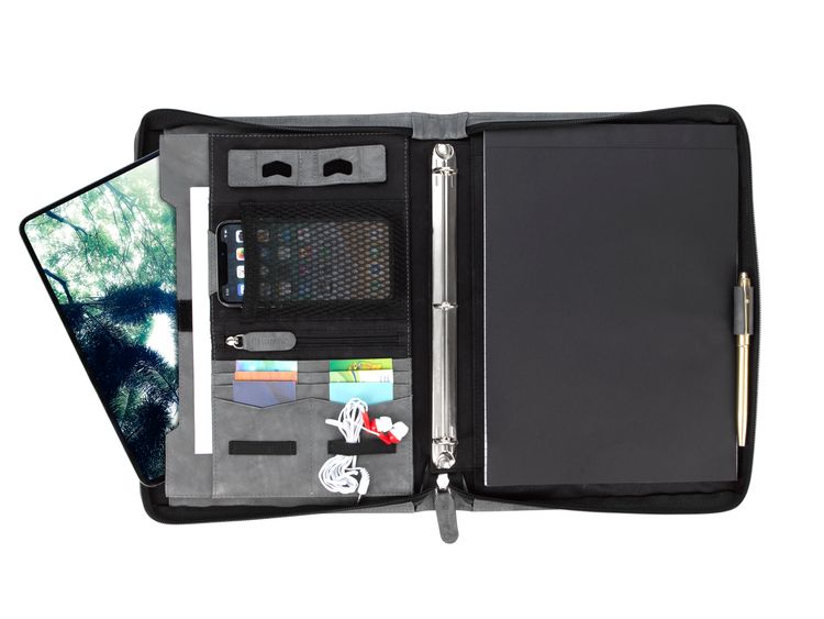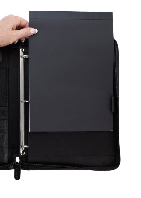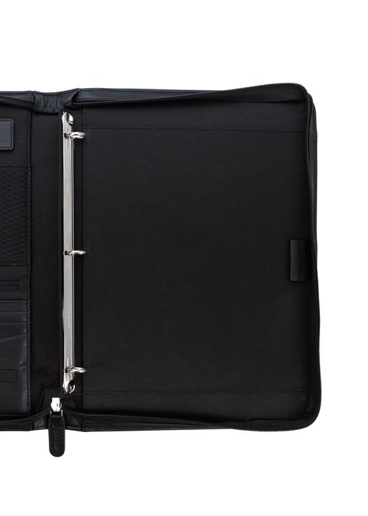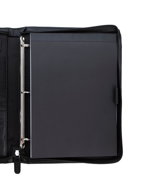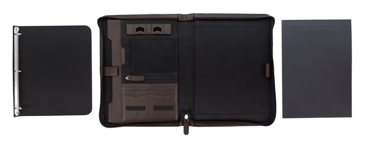 Stay organized and make a lasting impression with this premium leather zippered padfolio. Designed with a built-in handle and sleek leather pulls, it combines professional style with everyday function. The cotton-lined interior features a tablet pocket, phone stand, zip and card storage, elastic bands for cables, and a detachable 3-ring binder with an FSC-certified notepad. From meetings to on-the-go productivity, this padfolio is crafted to perform as beautifully as it looks. Because it is a natural material, irregularities in the consistency of this product’s leather are inherent to its natural beauty and personality. Additional decoration charges may apply.