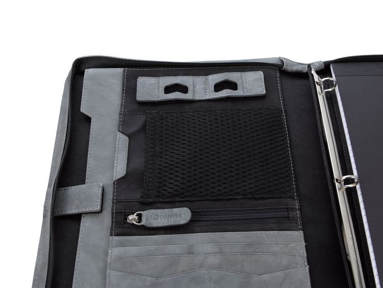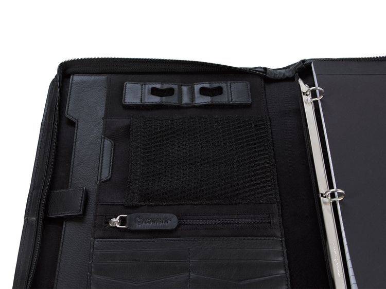 Interior zippered pocket, card slots, pen loops, and elastic bands for cables