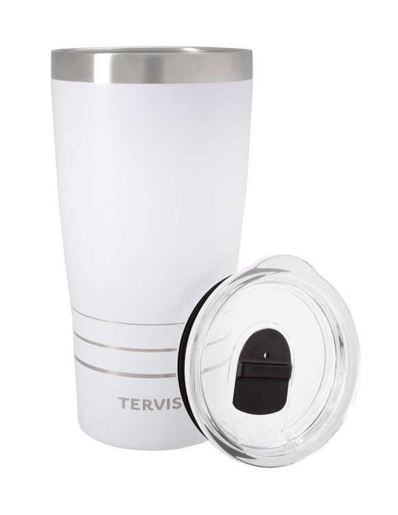 This premium 20 oz. stainless steel tumbler is expertly crafted from high-grade 18/8 stainless steel for exceptional durability. The double-wall vacuum insulation, complemented by a copper lining, ensures your drinks stay hot or cold for hours Its clear BPA-free lid features a sleek black slider that is both splash and shatterproof, while the tough powder-coated finish offers a stylish touch and a secure grip. Designed to fit most cup holders and equipped with a quiet non-slip base, this tumbler is the ideal companion for your busy lifestyle. Tervis covers this product with a 2-year limited guarantee (excluding imprint). Additional decoration charges may apply.