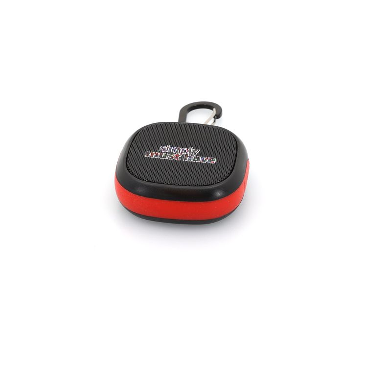 The Water-Resistant Speaker with Carabiner is IPX4 rated and has a 3W output for playing music. Additional decoration charges may apply.