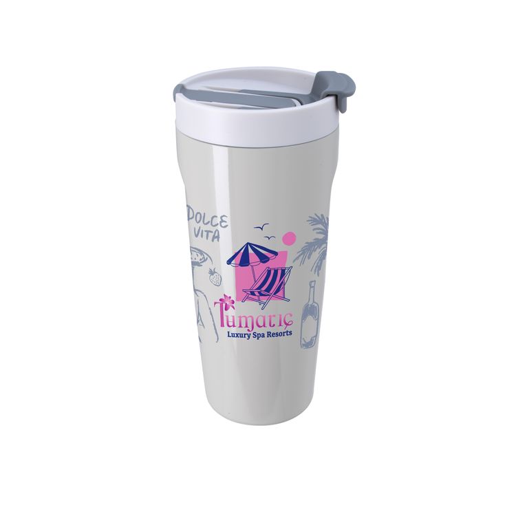 This 26 oz. tumbler features a recycled stainless steel body with vacuum insulation, keeping drinks hot or cold for hours. Its side-contour design offers a comfortable, easy grip, while the screw-on, spill-resistant lid features an integrated straw and a flap-seal closure for versatile sipping. Tumbler body made from 90% post-consumer recycled stainless steel; lid made from 100% post-consumer recycled polypropylene. Additional decoration charges may apply.