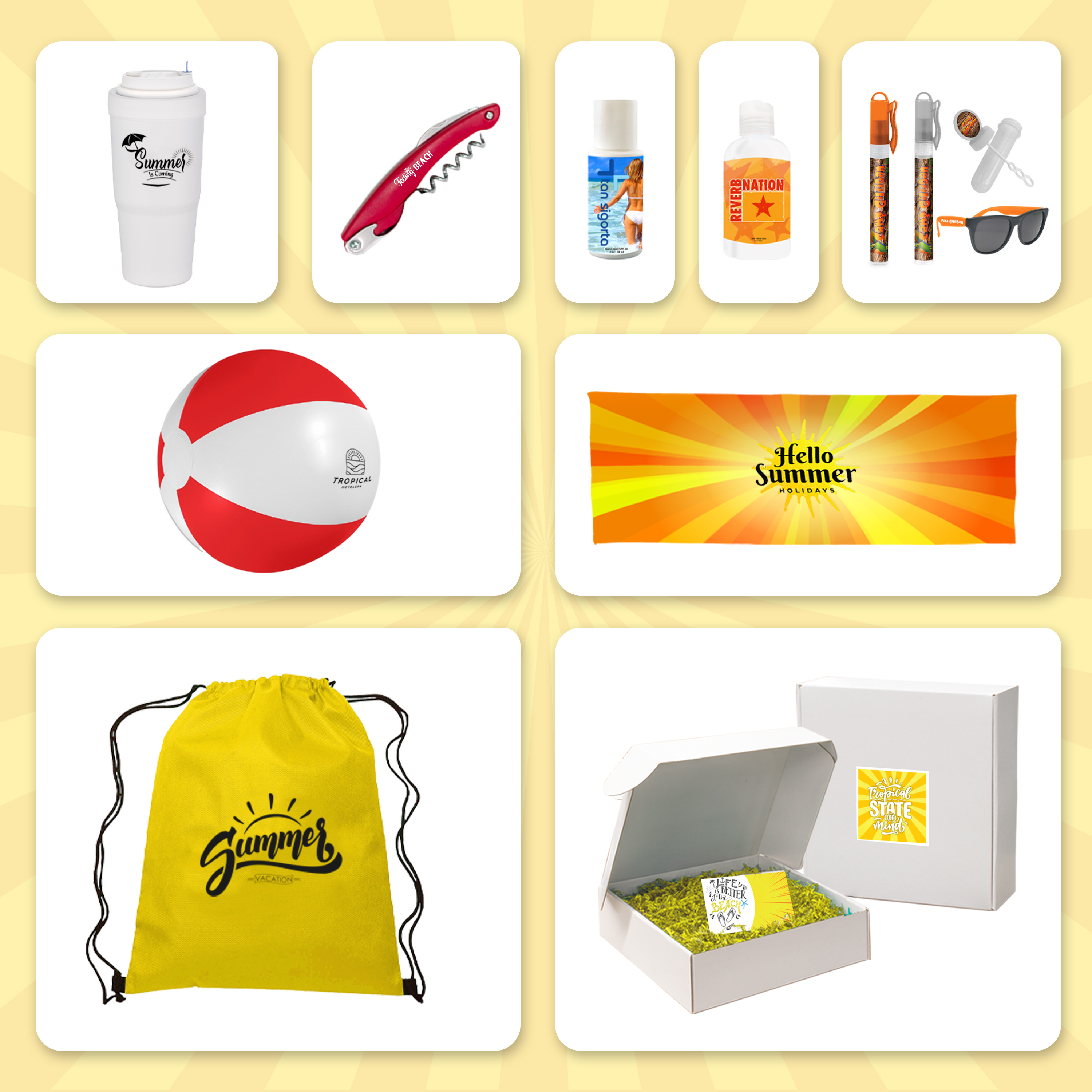 Your promotion or event will be a ray of sunshine with this comprehensive kit built for a day in the sun. Stay protected with SPF 30 sunscreen, shield eyes with UV400 sunglasses, hydrated with the multipurpose Versa Cup and keep refreshed with a full color cooling tool. Remember to have fun with the beach ball. More useful items round out the kit.