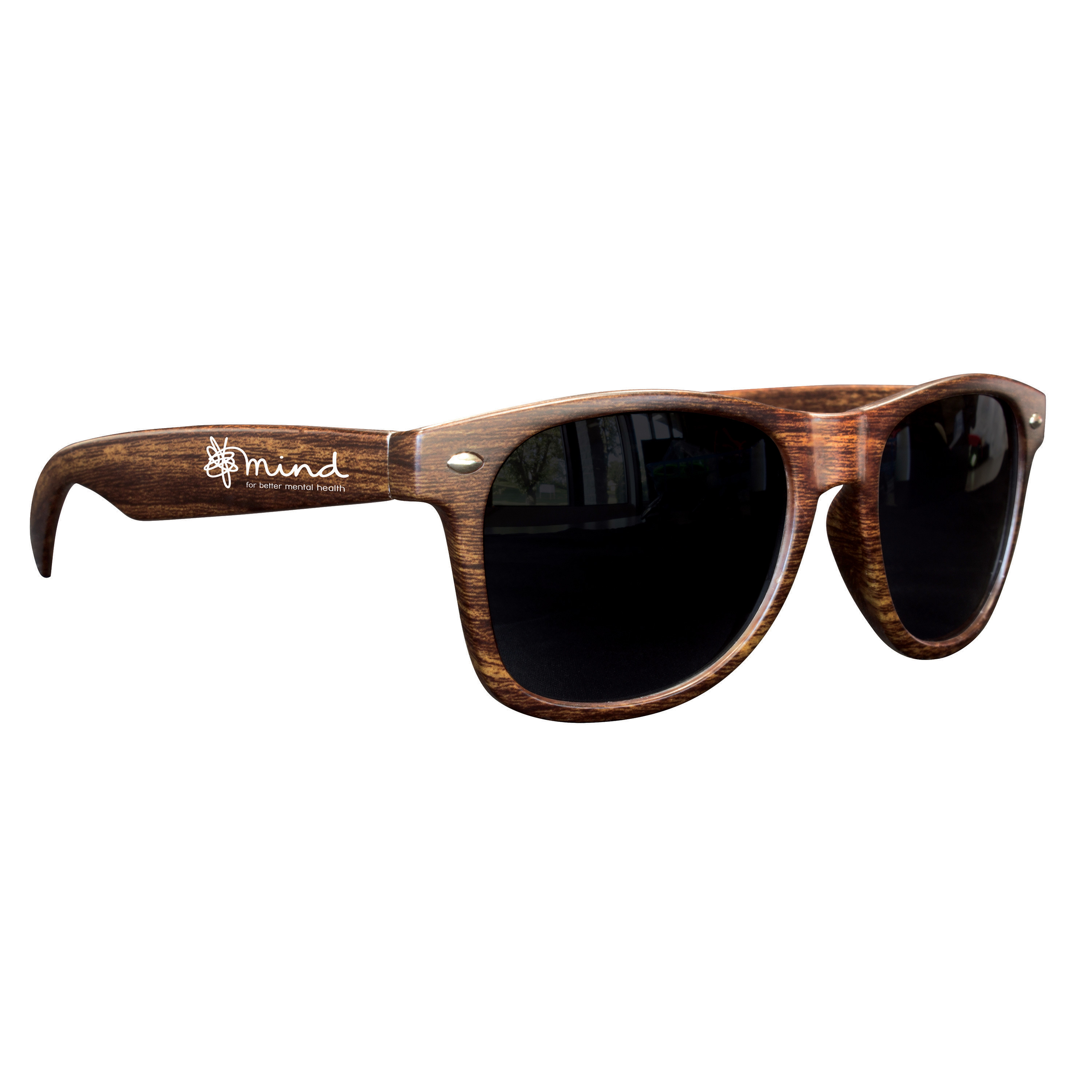 Shield your eyes from the sun in style with our Medium Wood Tone Miami Sunglasses. Constructed with a hard frame made from durable Polycarbonate, these sunglasses are 100% FDA Approved. Makes for a high end giveaway at a great price. UVA and UVB Protection.