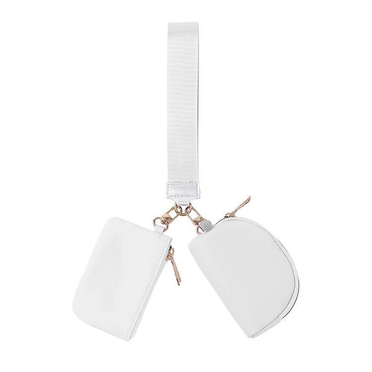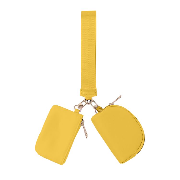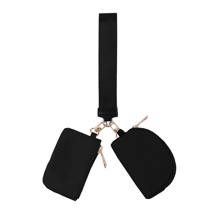 Modern utility meets sleek design. Crafted from smooth, durable nylon, this accessory redefines how you carry your essentials. The design features a comfortable wide-webbing wristlet strap holding two distinct, detachable pouches: a rectangular case perfect for credit cards and IDs, and a semi-circular pouch ideal for coins, earbuds, or keys. Finished with high-shine metallic hardware and smooth-gliding zippers, this dual-pouch set keeps your valuables organized and within easy reach. Material: Nylon.
