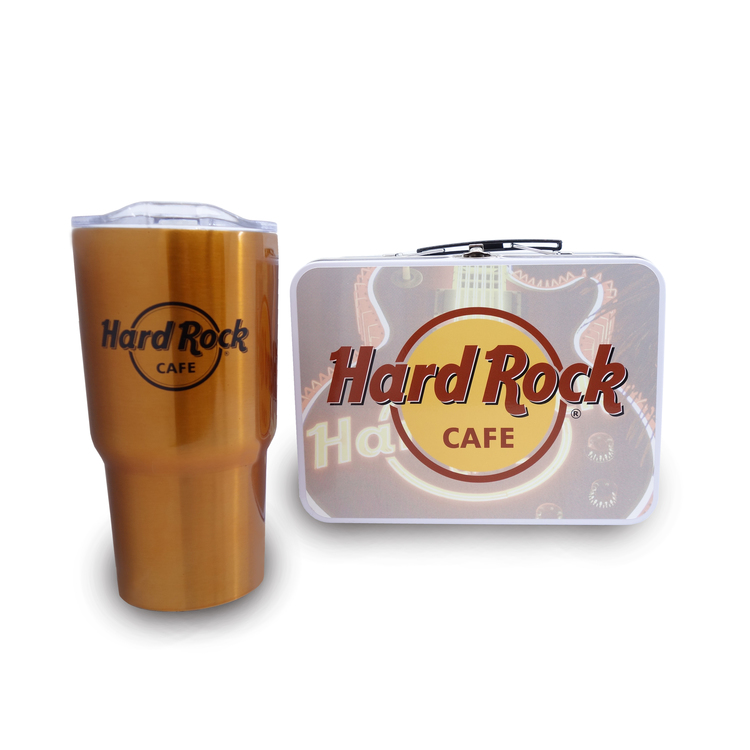 Includes a 20 oz. stainless steel contoured tumbler in a metal lunch box
