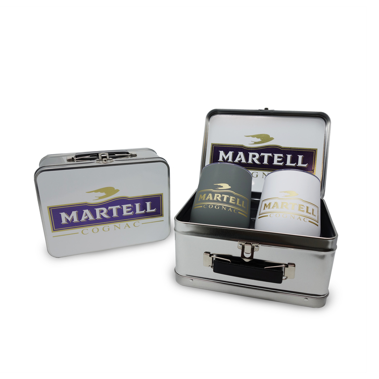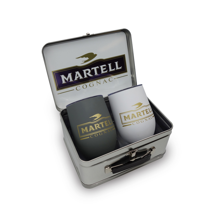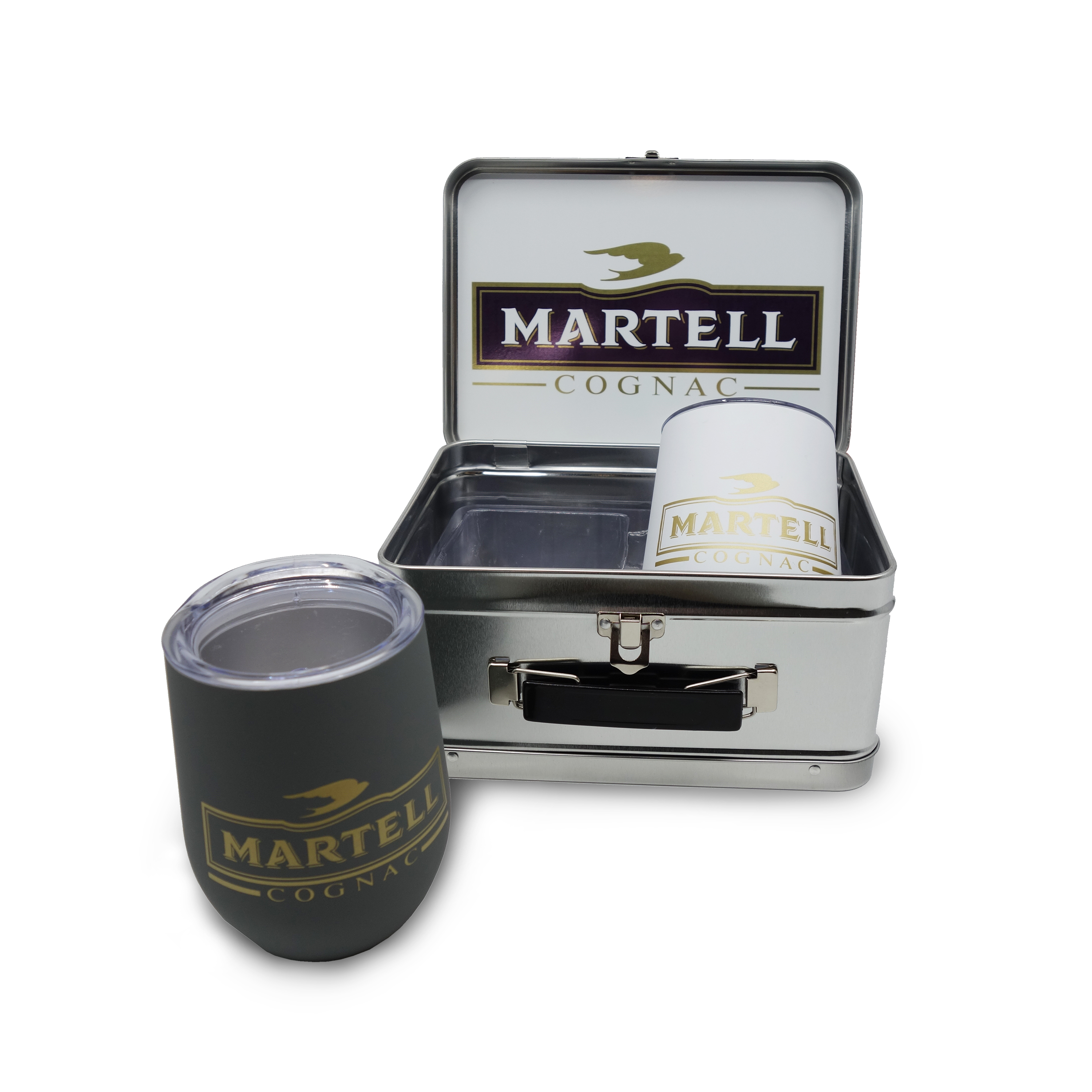 Includes two 12 oz. stemless wine glasses with a rubberized finish in a metal lunch box
