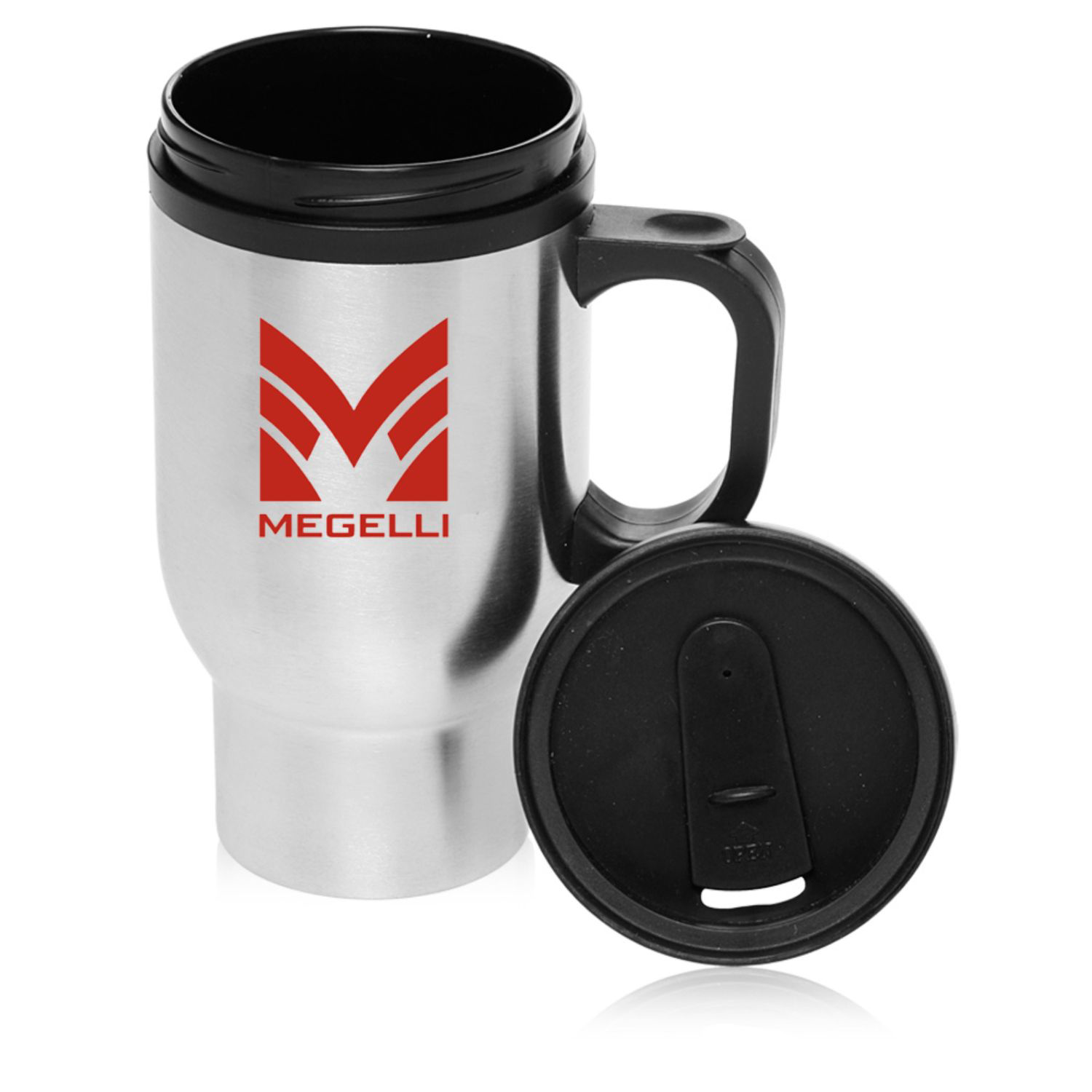 Promote your brand with our 16 oz Stainless Steel Travel Mugs With Custom Logo, this trendy travel mugs offers 201 Stainless Steel Exterior and Plastic Interior. It's Plastic lid and handle with Spill-proof slide lock Lid. This popular Travel Mug measures 6.75" H x 3.4" W and features a large imprint area of 2.50" W x 2.00" H ideal for maximum brand exposure. These practical travel mugs are the perfect way to gain visibility at company picnics, marathons, football, baseball, trade shows, and more!