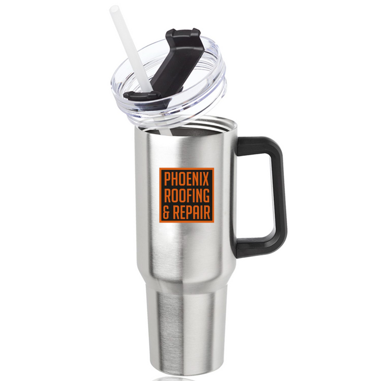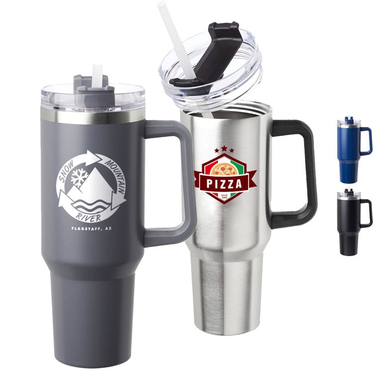 Advertise your brand with our 40 oz Stainless Steel Travel Mugs W/ Handle! Made of high-quality mugs. This popular Travel Mug measures 4" W x 8.74" H x 3" B and features a large imprint area of 3" W x 3" H ideal for maximum brand exposure. These practical travel tumblers are the perfect way to gain visibility at company picnics, marathons, football, baseball, trade shows, and more!