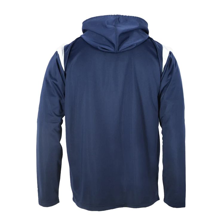 Designed for active lifestyles and casual comfort, this brushed tricot hoodie combines warmth and mobility with stylish contrast inserts. Crafted from 100% polyester and weighing 240 gsm, it delivers a soft yet durable feel ideal for training sessions or everyday wear. The two front pockets include a built-in media hole for convenient device access, while the double-needle stitching reinforces its strength. Clean design lines with bold white contrast details give this hoodie a sharp, athletic look.