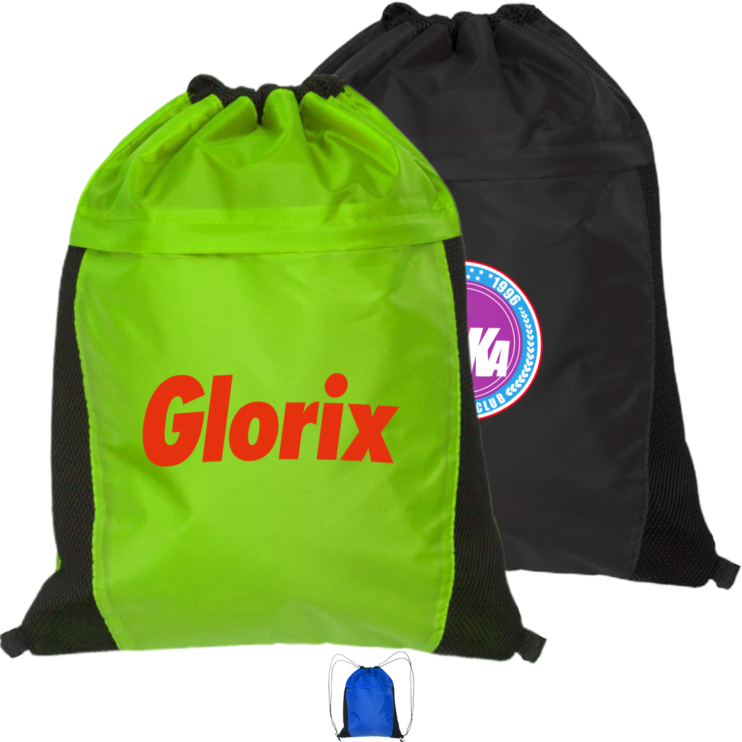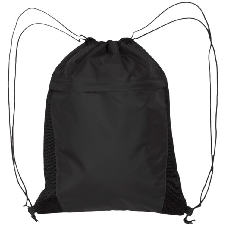 These drawstring backpacks made of polyester with side and top mesh accents that strengthen the bag's body for durability with13.5"L X 17"H size. Gym goers and light travelers will like the roomy main bag, and the front zipper pocket makes it simple to access items like electronics with large imprint area 6.50"W x 9.00"H decorated in US. You can add your own artwork or a logo to the roomy front imprint area.