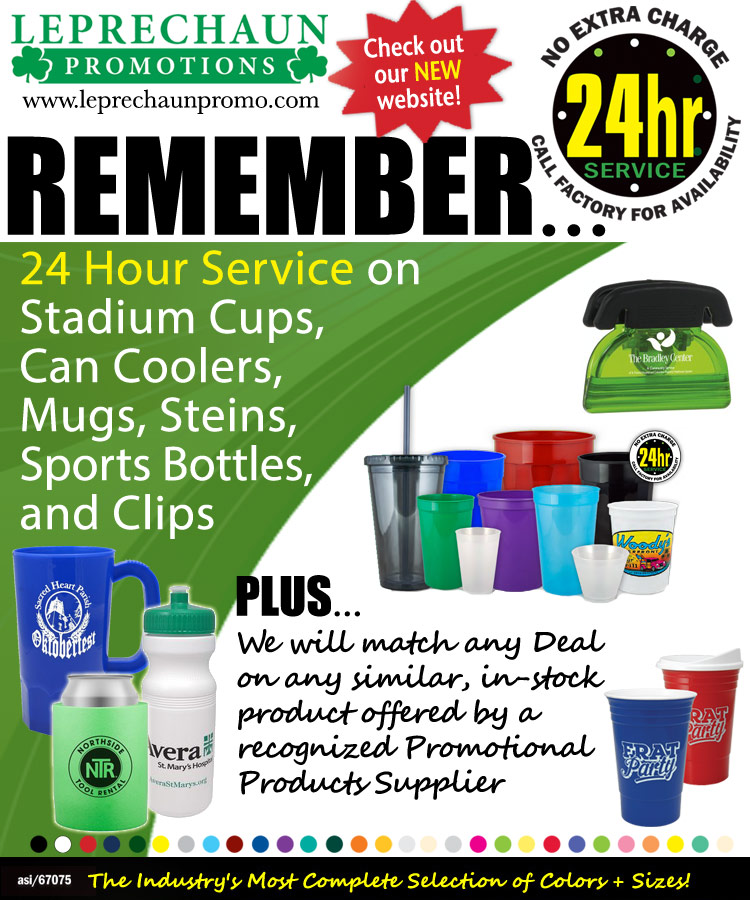 Put Some Fun in Your Event w/Translucent Plastic Cups - Plastic Cups |  Budget Priced Sports Bottles w/Free 24 Hr. Svc. From Leprechaun - Sports Bottles |  Durable Budget Priced Styrofoam Cups w/Free 24 Hr. Svc. From Leprechaun - Cups |